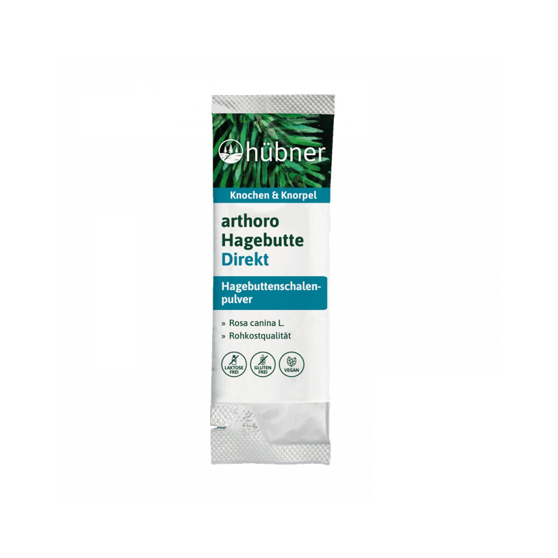 Die hübner® arthoro Hagebutte Direkt Sticks enthalten 100 % Hagebuttenschalenpulver in Bio-Qualität. Durch das schonende Verarbeitungsverfahren der getrockneten Früchte können hitzeempfindliche Inhaltsstoffe erhalten bleiben. Denn die Hagebutte enthält wertvolles und natürliches Vitamin C. Vitamin C trägt zu einer normalen Kollagenbildung für eine normale Knorpelfunktion und normale Funktion der Knochen und des Immunsystems bei.