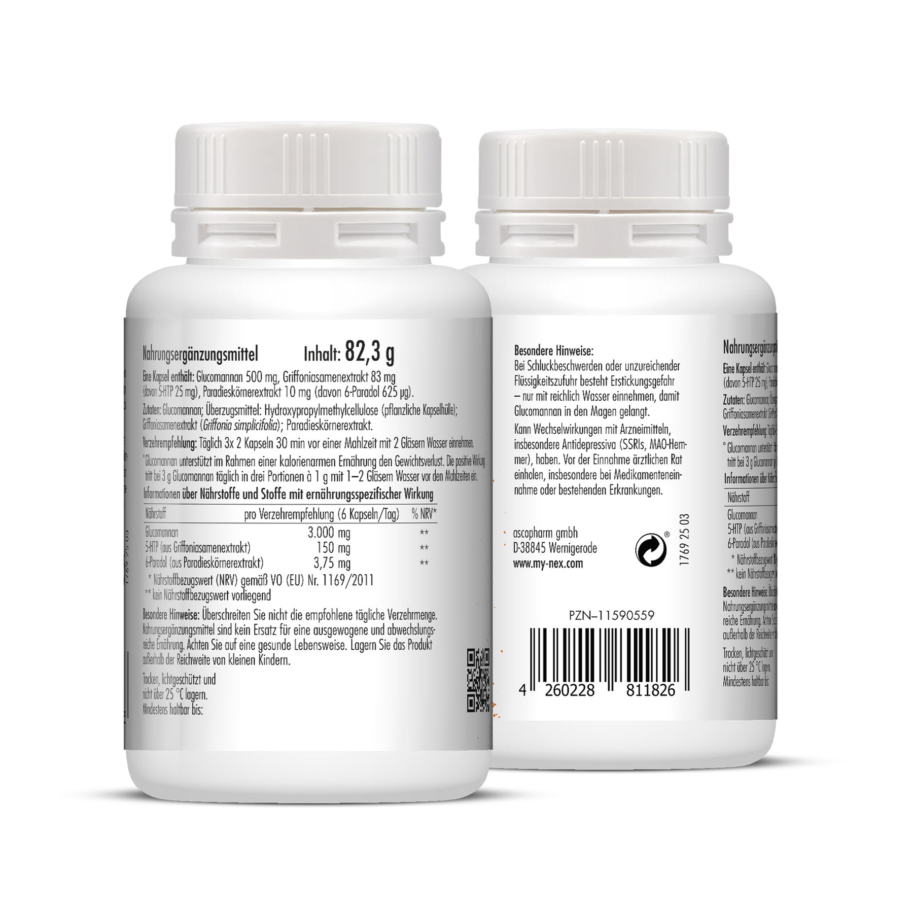 Eine Kapsel enthält:Glucomannan 500 mg, Griffonia simplicifolia Samenextrakt 84 mg (davon 5-HTP 25 mg), Paradieskörnerextrakt 10 mg (davon 6-Paradol 625 μg).