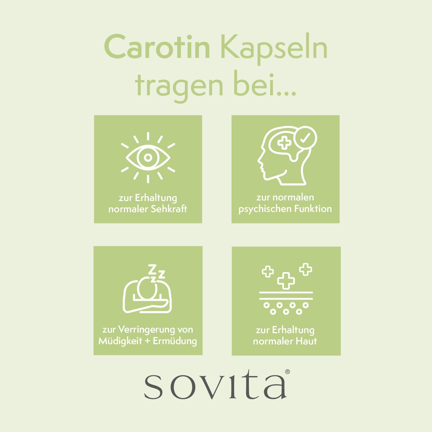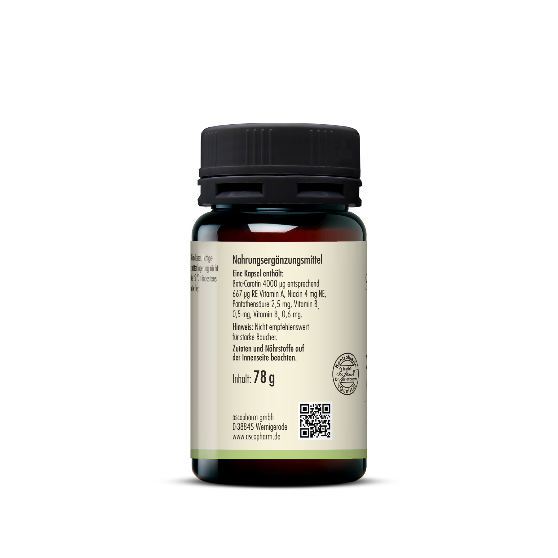 Beta-Carotin ist Hauptbestandteil der Kapseln. Dabei handelt es sich um eine Gruppe der Carotinoide, die zu den sekundären Pflanzenstoffen zählt. Während Vitamin A nur in tierischen Lebensmitteln vorkommt, ist das Provitamin A (β-Carotin) auch in pflanzlichen Produkten enthalten. Provitamine können vom Körper selbst bedarfsgerecht in Vitamine umgewandelt werden, sodass dieser ausreichend Vitamin A erhält.