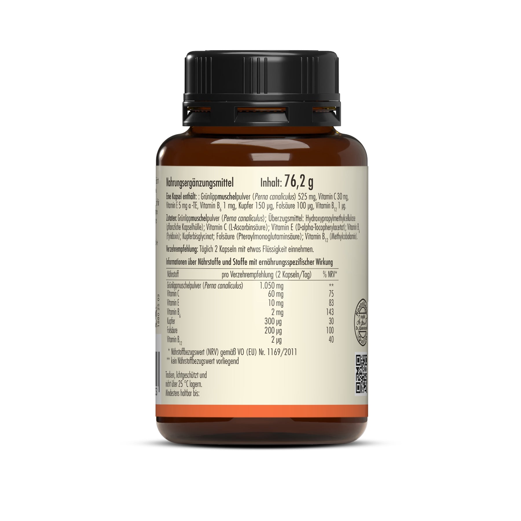 Die neuseeländische Grünlippmuschel (Perna canaliculus) ist für ihren natürlichen Gehalt an marinen Nährstoffen bekannt. In unseren Grünlippmuschel Kapseln wird das hochwertige Muschelpulver mit ausgewählten Mikronährstoffen kombiniert, um eine gezielte Ergänzung der täglichen Ernährung zu ermöglichen. Die enthaltenen Vitamine und Spurenelemente unterstützen verschiedene Körperfunktionen, insbesondere im Bereich des Bindegewebes, des Immunsystems und des Energiestoffwechsels.