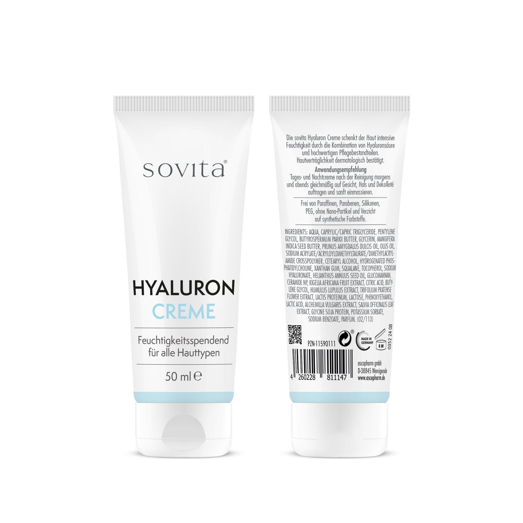 sovita Hyaluron Creme ist eine straffende Tages- und Nachtcreme mit der feuchtigkeitsbindenden Tiefenwirkung der Hyaluronsäure. Die intensive Formel mit pflanzlichen Konjac Mannanen und Milchproteinen mildert sichtbar Fältchen, sorgt für jugendliche Spannkraft sowie Vitalität und ist für jeden Hauttyp geeignet. Kostbare Pflegefaktoren wie Mangokern- und Sheabutter schützen und beruhigen die Haut zusätzlich. Müde und kraftlose Haut erscheint in einem strahlend frischen Teint.