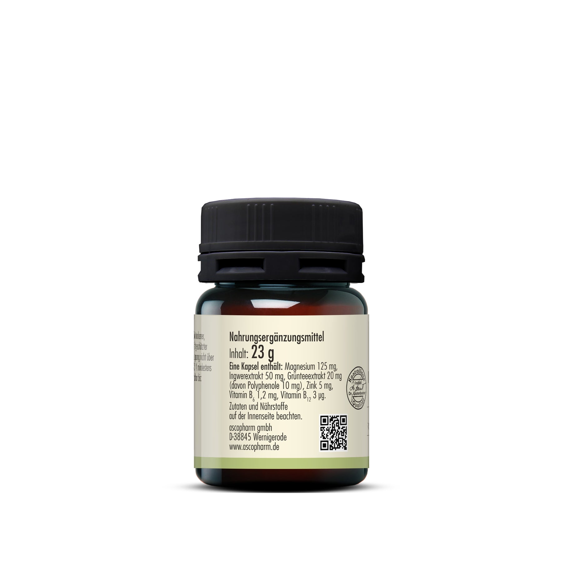 Magnesiumoxid; Überzugsmittel: Hydroxypropylmethylcellulose (Kapselhülle); Ingwerextrakt (16 %); Zinkbisglycinat; Grünteeextrakt (5 %); Vitamin B6 (Pyridoxinhydrochlorid); Vitamin B12 (Cyanocobalamin).