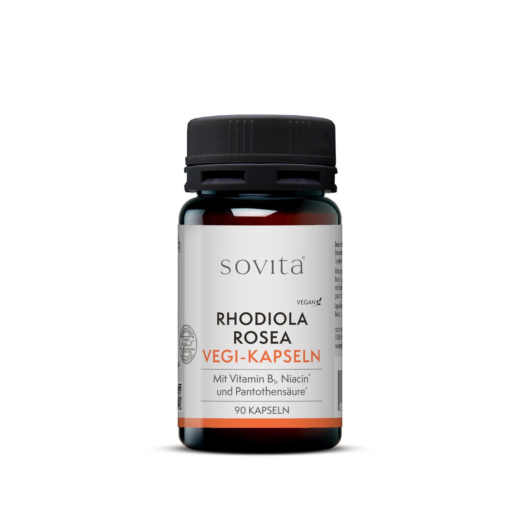 Die sovita Rhodiola Rosea Vegi-Kapseln wurden entwickelt, um Wohlbefinden und Stressresistenz zu erhöhen. Der enthaltene Wurzel-Extrakt weist einen Gehalt von mindestens 3 % Rosavinen auf. Dies sind wertvolle sekundäre Pflanzenstoffe der Wurzel. Zusätzlich enthalten die Kapseln Vitamin B1, Niacin und Pantothensäure. Vitamin B1 und Niacin tragen zur normalen psychischen Funktion bei. Durch die Pantothensäure wird die mentale Kraft unterstützt, denn dieses Vitamin spielt eine Rolle bei der normalen geistigen Leistung und trägt zur Verringerung von Müdigkeit bei.
