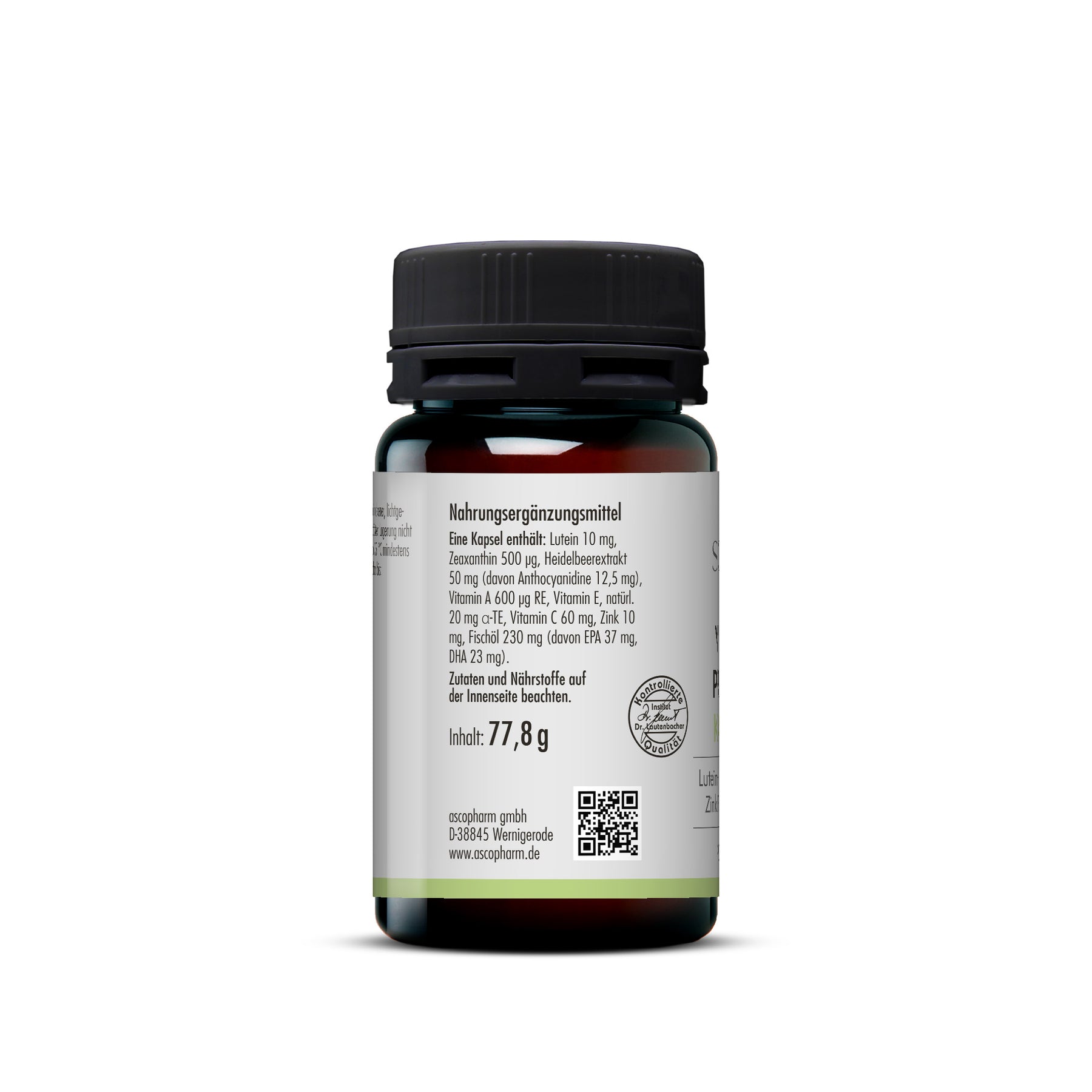 Lutein 10 mg, Zeaxanthin 500 µg, Heidelbeerextrakt 50 mg (davon Anthocyanidine 12,5 mg), Vitamin A 600 µg RE, Vitamin E, natürl. 20 mg α-TE, Vitamin C 60 mg, Zink 10 mg, Fischöl 230 mg (davon EPA 37 mg, DHA 23 mg).