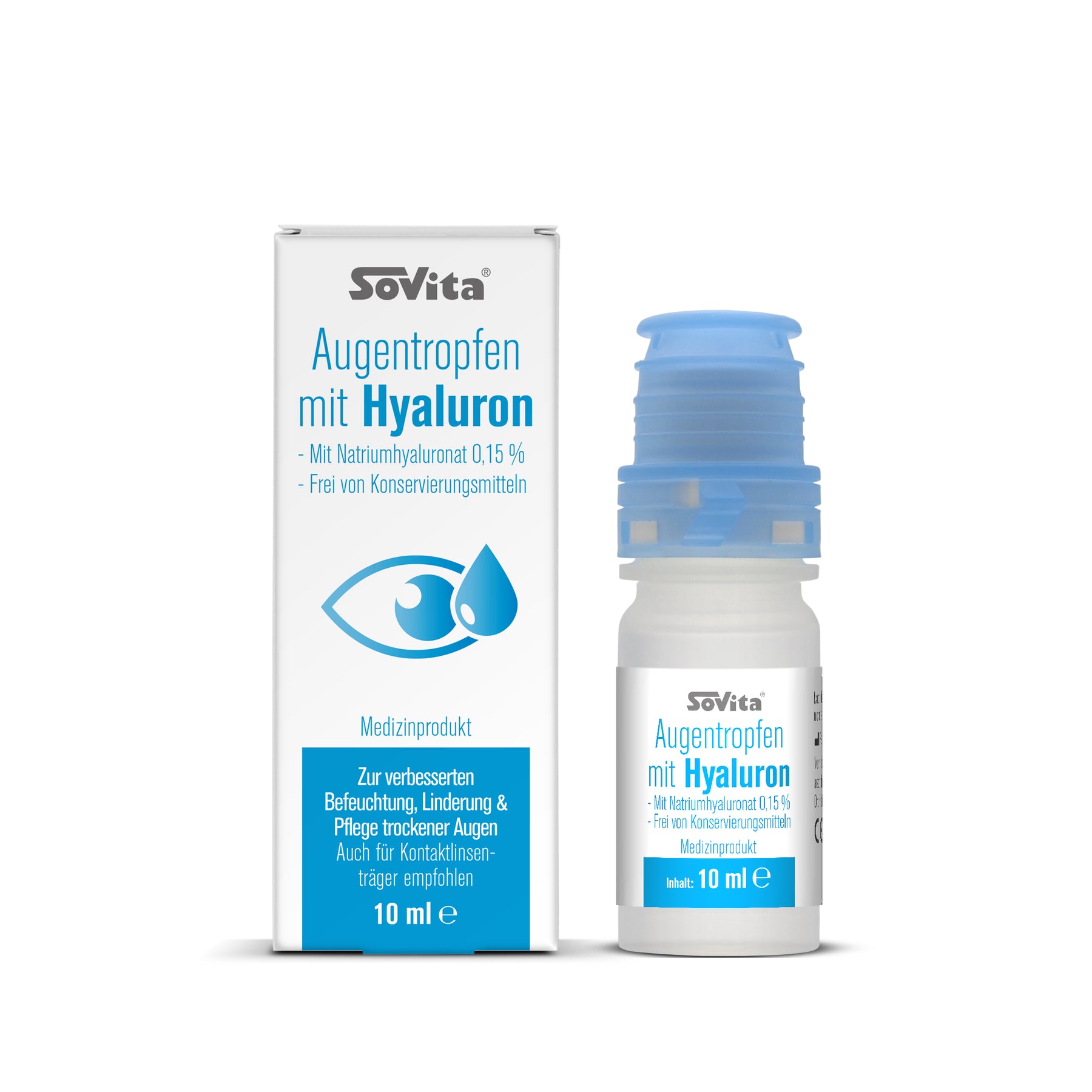 Unsere sovita Augentropfen mit Hyaluron enthalten Natriumhyaluronat, das Natriumsalz der Hyaluronsäure, das aufgrund seiner besonderen physikalischen Eigenschaft einen gleichmäßigen, stabilen und besonders lang haftenden Schutzfilm auf der Hornhaut bildet, ohne die Sehleistung zu beeinträchtigen.