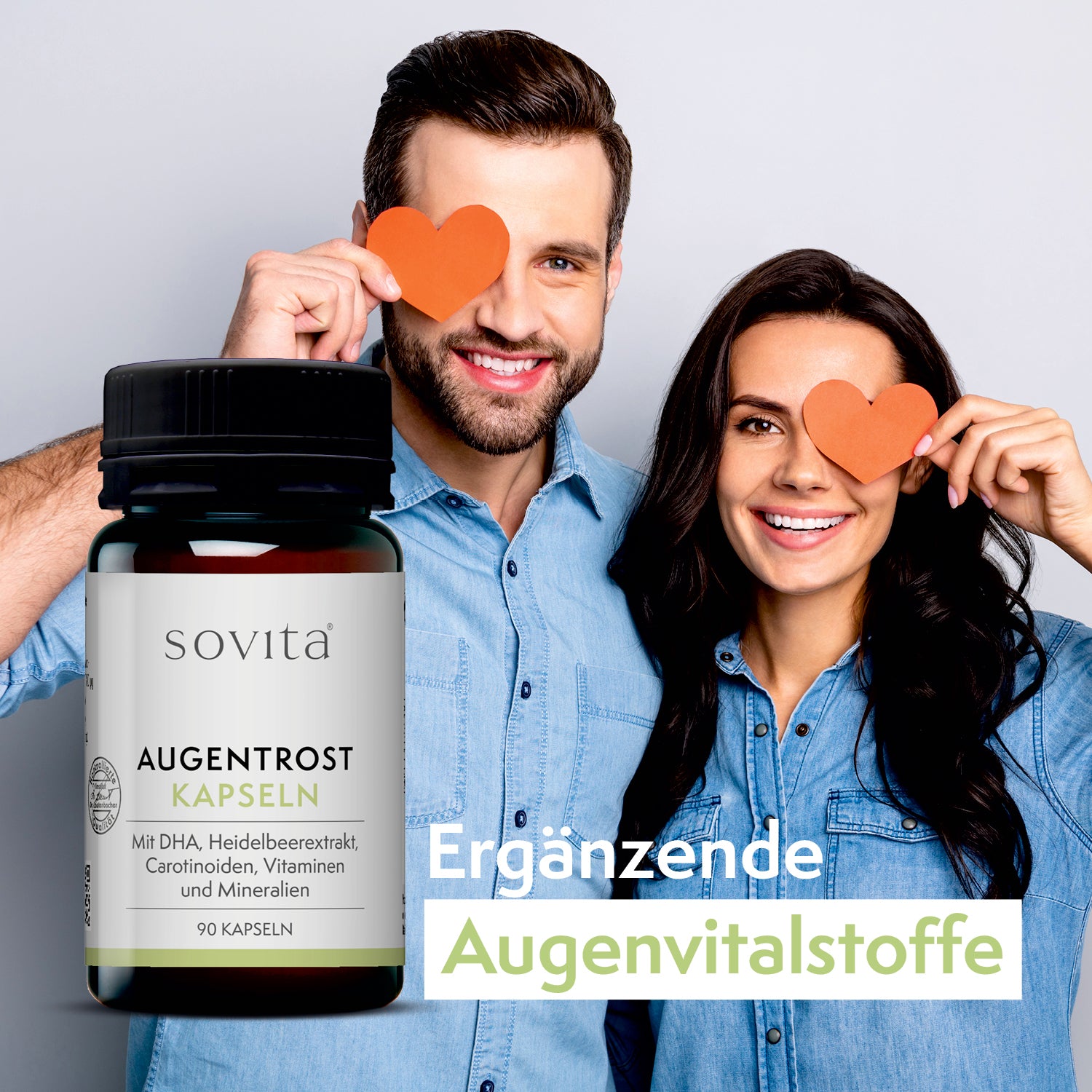 Augentrost Kapseln versorgen Sie mit wichtigen Vitalstoffen, die sich in ihren Aufgaben für den Sehprozess ergänzen. So leistet Vitamin E einen Beitrag zum Schutz der Zellen vor oxidativem Stress. Enthaltenes Beta-Carotin (Provitamin A) ist die Vorstufe von Vitamin A und wird im Körper bedarfsgerecht in Vitamin A umgewandelt. Vitamin A trägt dann, wie auch Zink und die Omega-3-Fettsäure DHA zum Erhalt der normalen Sehkraft bei. Hierbei liefern die sovita Augentrost Kapseln genau die Menge, die benötigt wird, um diese positive Wirkung zu erzielen. Vervollständigt wird die spezielle Vitalstoffkombination durch die Carotinoide Lutein und Zeaxanthin sowie einen polyphenolreichen Heidelbeerextrakt.
