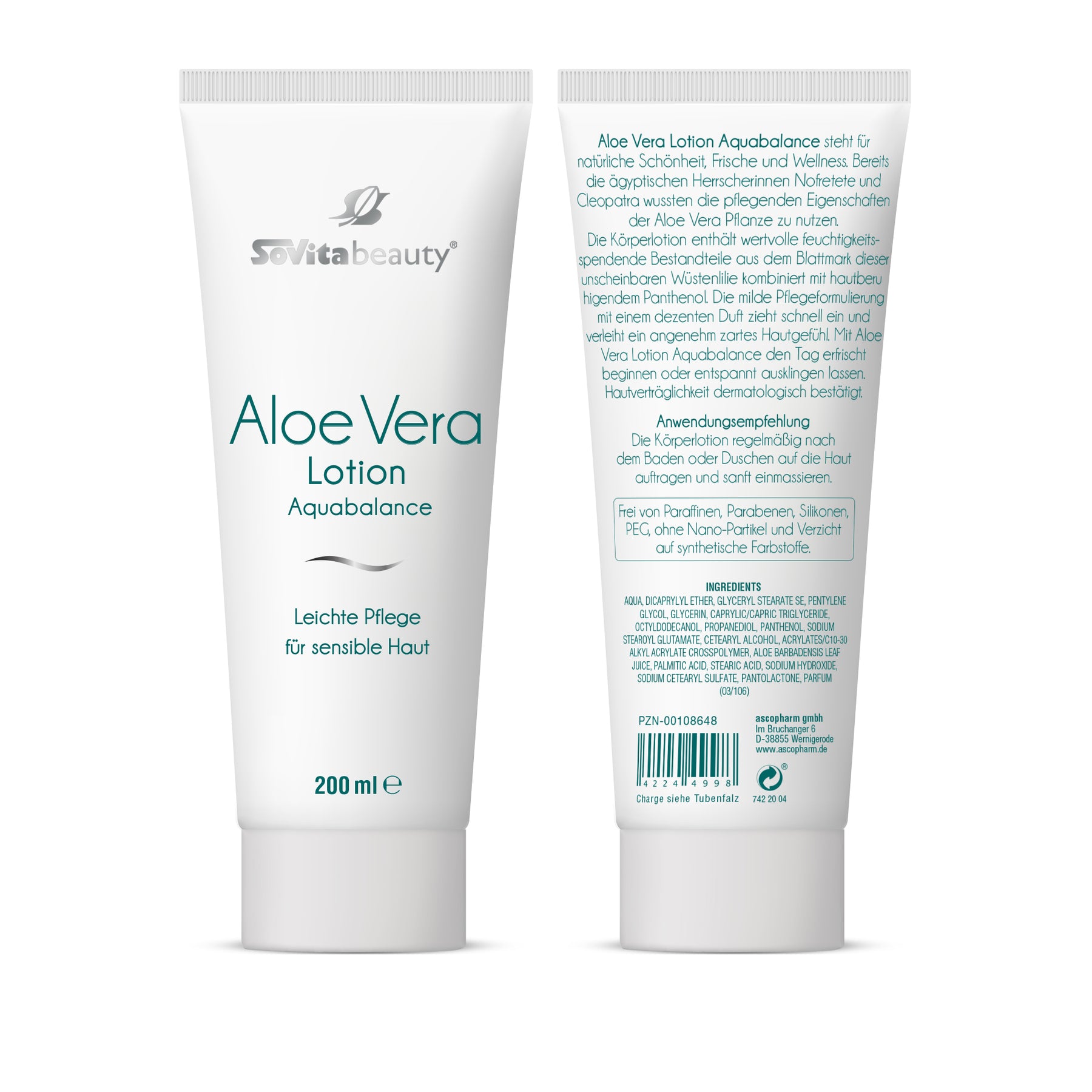 Die sovita Aloe Vera Lotion ist ein erstklassiges Pflegeprodukt, das Ihre Haut mit intensiver Feuchtigkeit versorgt und gleichzeitig beruhigt. Die Lotion basiert auf dem wertvollen Aloe-Vera-Saft und wurde speziell für trockene Haut entwickelt. Ihre Haut wird spürbar revitalisiert und erhält ein erfrischendes Wohlbefinden.