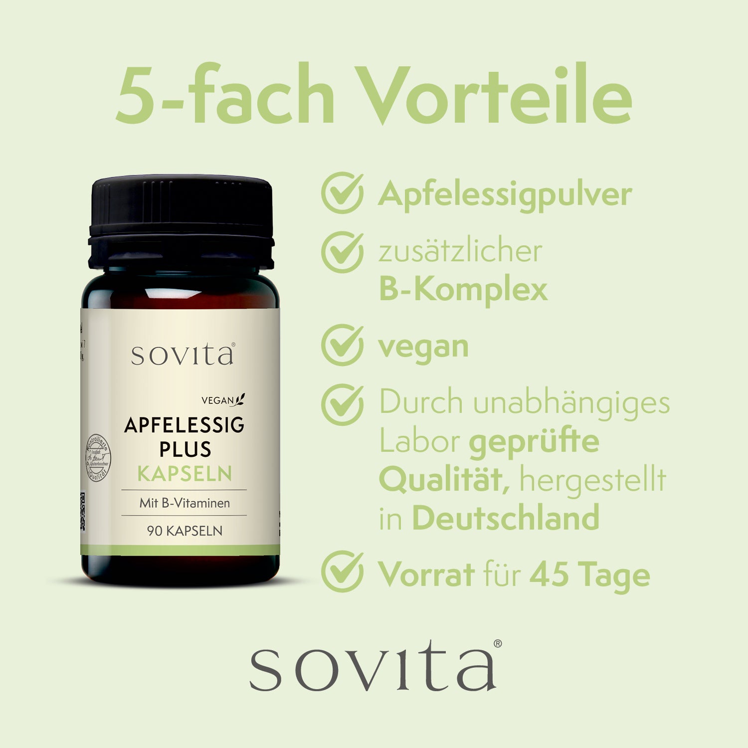 Die sovita Apfelessig Plus Kapseln bieten die traditionellen Vorteile von Apfelessig als Pulver in einer praktischen Kapselform. Sie sind ideal für alle, die von den positiven Eigenschaften des Apfelessigs profitieren möchten, ohne den intensiven Geschmack zu erleben.