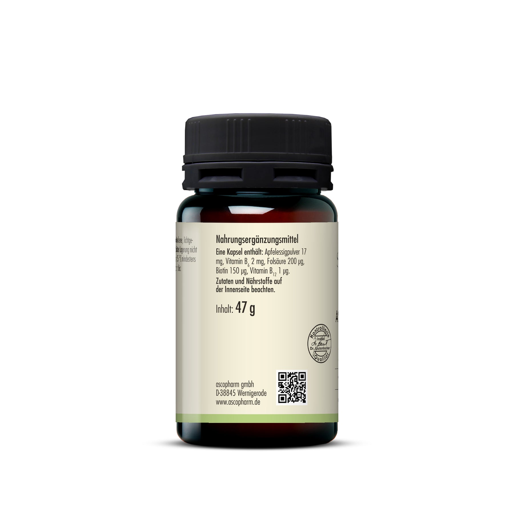 Leinsamenmehl; Überzugsmittel: Hydroxypropylmethylcellulose (pflanzliche Kapselhülle); Apfelessigpulver (3,1 %); Vitamin B6 (Pyridoxinhydrochlorid); Folsäure (Pteroylmonoglutaminsäure); Biotin (D-Biotin); Vitamin B12 (Cyanocobalamin).
