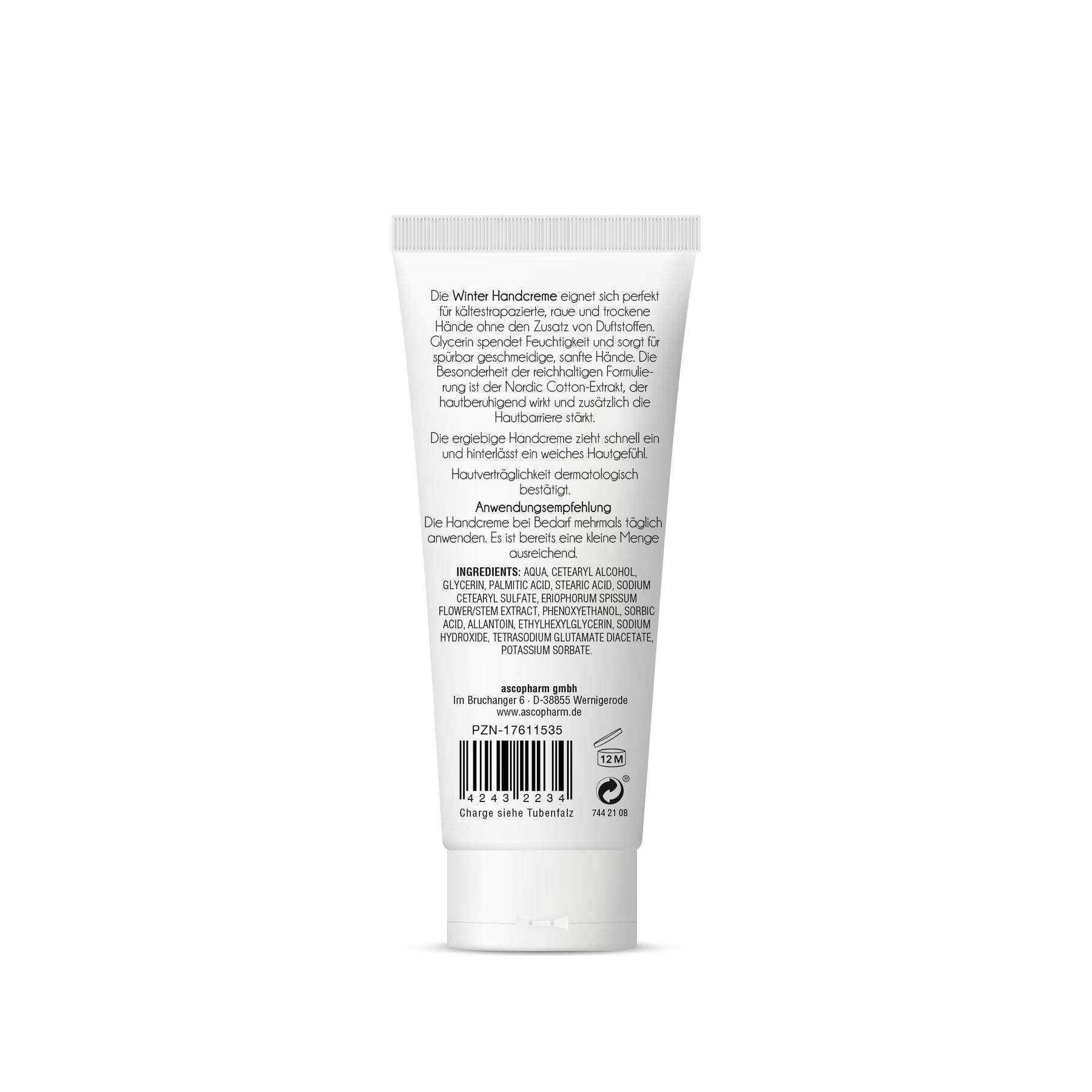 Die Winter Handcreme eignet sich perfekt für kältestrapazierte, raue und trockene Hände ohne den Zusatz von Duftstoffen. Glycerin spendet Feuchtigkeit und sorgt für spürbar geschmeidige, sanfte Hände. Die Besonderheit der reichhaltigen Formulierung ist der Nordic Cotton-Extrakt, der hautberuhigend wirkt und zusätzlich die Hautbarriere stärkt. Die ergiebige Handcreme zieht schnell ein und hinterlässt ein weiches Hautgefühl.