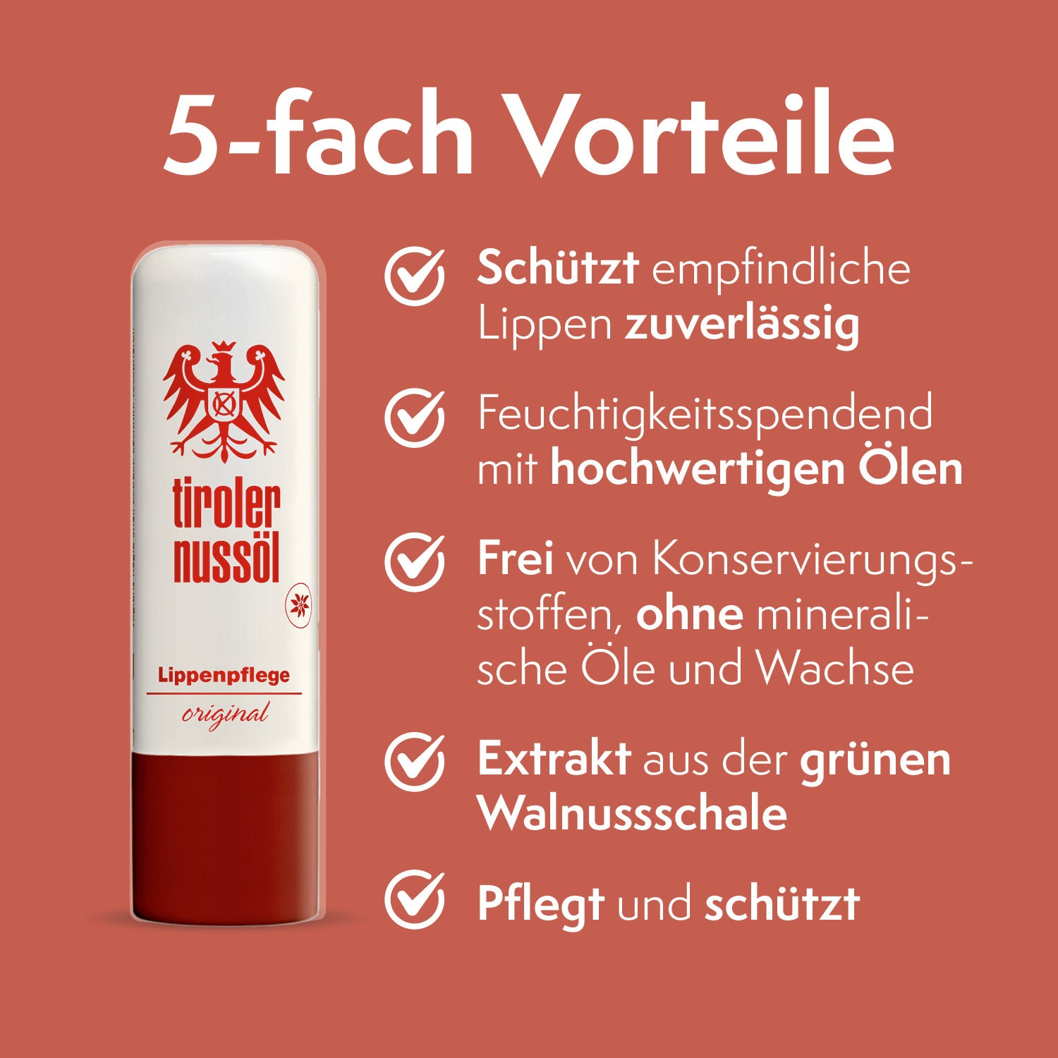 Zur täglichen Pflege auch empfindlicher Lippen, frei von Parfüm, Farb- und Konservierungsstoffen, ohne mineralische Öle und Wachse.Erhältlich als Lippenpflegestift InhaltstoffeEthylhexyl Stearate, Ricinus Communis Seed Oil, Synthetic Beeswax, Hydrogenated Palm Oil, Cera Alba, Candelilla Cera, Ascorbyl Palmitate, Aroma, Benzyl Alcohol, Helianthus Annuus Seed Oil, Hexyldecanol, Hexyldecyl Laurate, Juglans Regia Shell Extract, Lecithin, TocopherolDermapharm GmbH (AT)Kleeblattgasse 4/131010 WienÖsterreichoffice@dermapharm.atKatalogartikelnummer: 1032