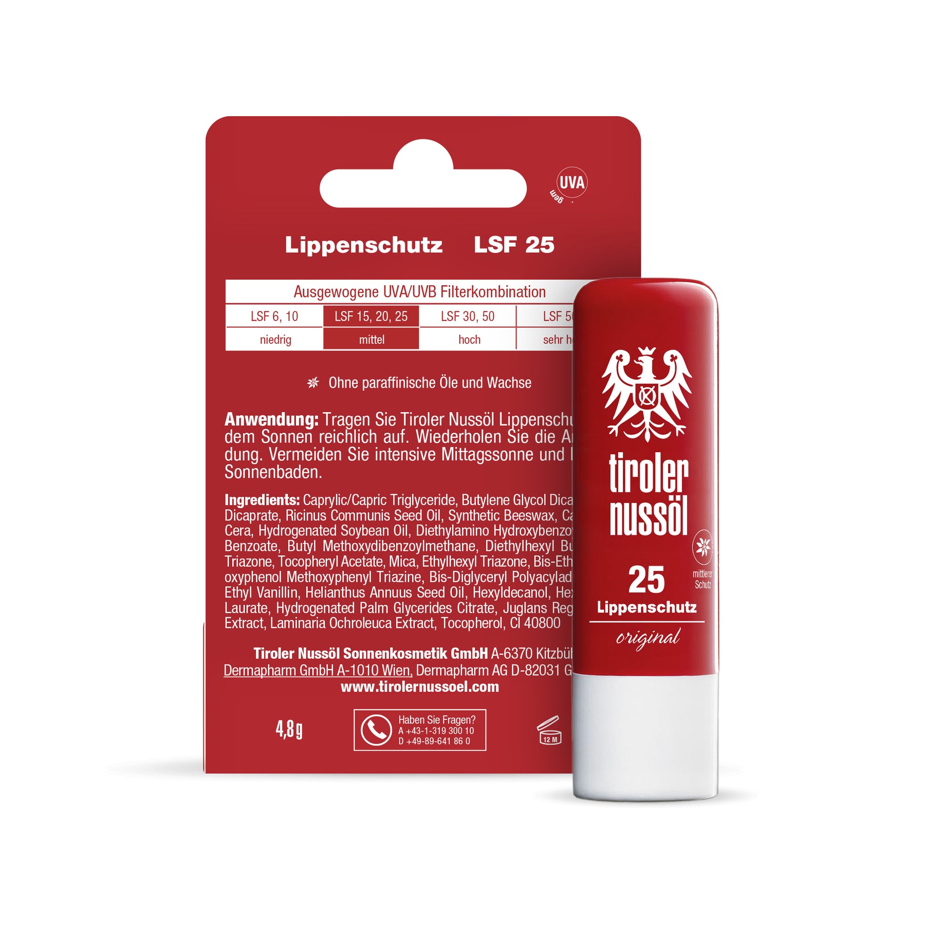 Lippenschutz-Stift mit SPF 25. Ideal zur täglichen Pflege auch von empfindlichen Lippen. Frei von Parfum- sowie Farb- und Konservierungsstoffen.Ohne mineralische Öle und Wachse.InhaltsstoffeCaprylic/Capric Triglyceride, Butylene Glycol Dicaprylate/Dicaprate, Ricinus Communis Seed Oil, Synthetic Beeswax, Candelilla Cera, Hydrogenated Soybean Oil, Diethylamino Hydroxybenzoyl Hexyl Benzoate, Butyl Methoxydibenzoylmethane, Diethylhexyl Butamido Triazone, Tocopheryl Acetate, Mica, Ethylhexyl Triazone, Bis-Ethylhexyloxyphenol Methoxyphenyl Triazine, Bis-Diglyceryl Polyacyladipate-2, Ethyl Vanillin, Helianthus Annuus Seed Oil, Hexyldecanol, Hexyldecyl Laurate, Hydrogenated Palm Glycerides Citrate, Juglans Regia Shell Extract, Laminaria Ochroleuca Extract, Tocopherol, CI 40800Dermapharm GmbH (AT)Kleeblattgasse 4/131010 WienÖsterreichoffice@dermapharm.atKatalogartikelnummer: 0938
