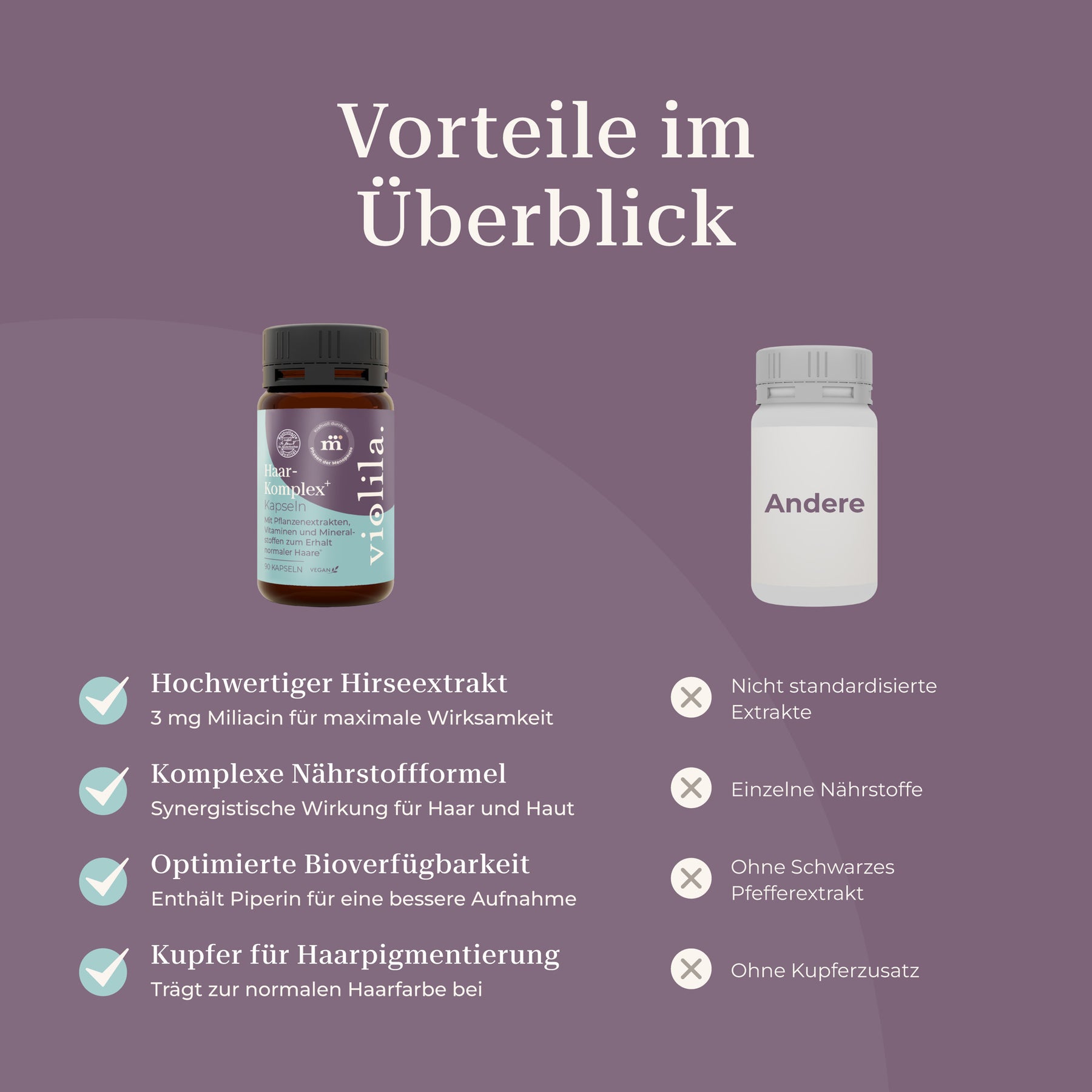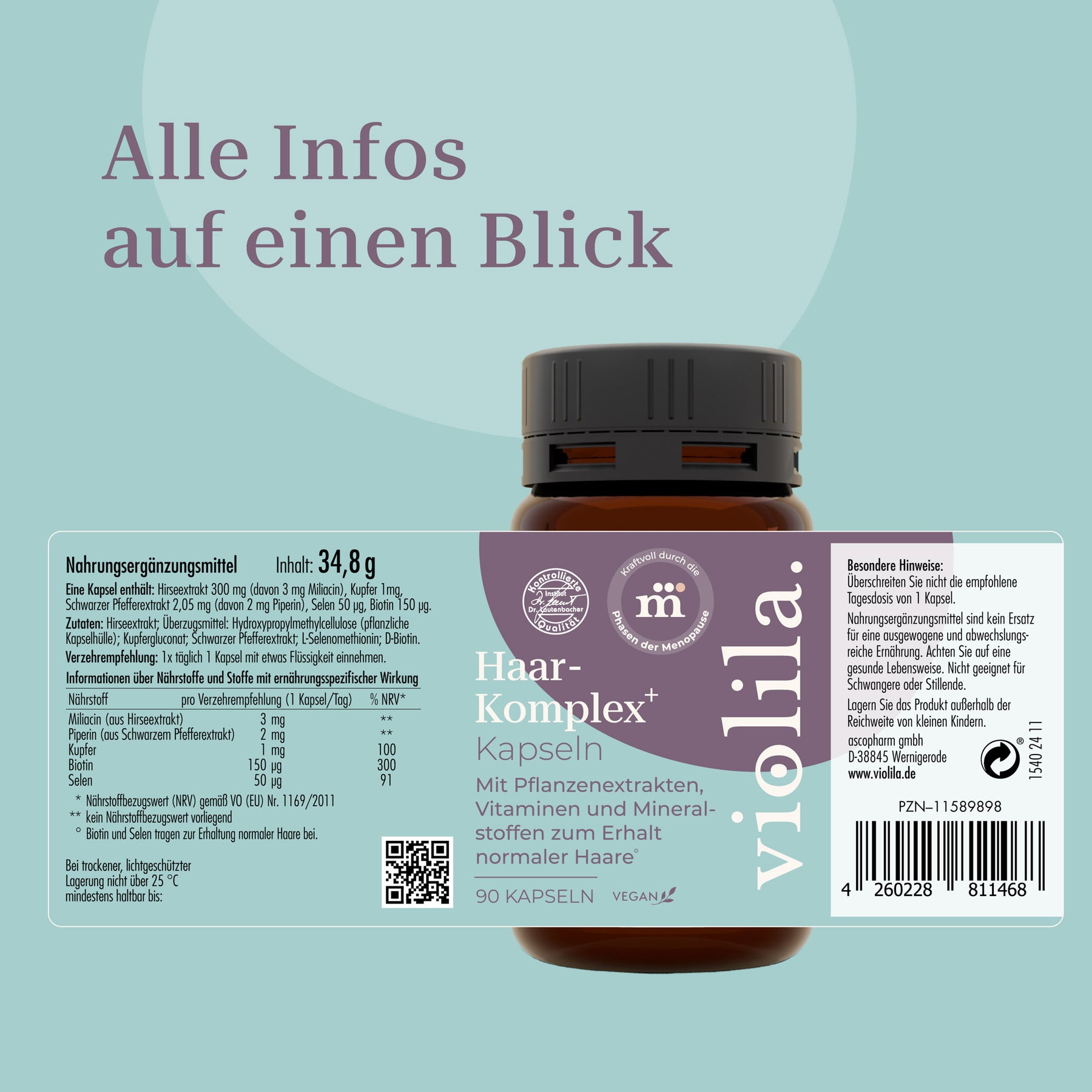 Hirseextrakt 300 mg (davon 3 mg Miliacin), Kupfer 1mg, Schwarzer Pfefferextrakt 2,05 mg (davon 2 mg Piperin), Selen 50 μg, Biotin 150 μg.