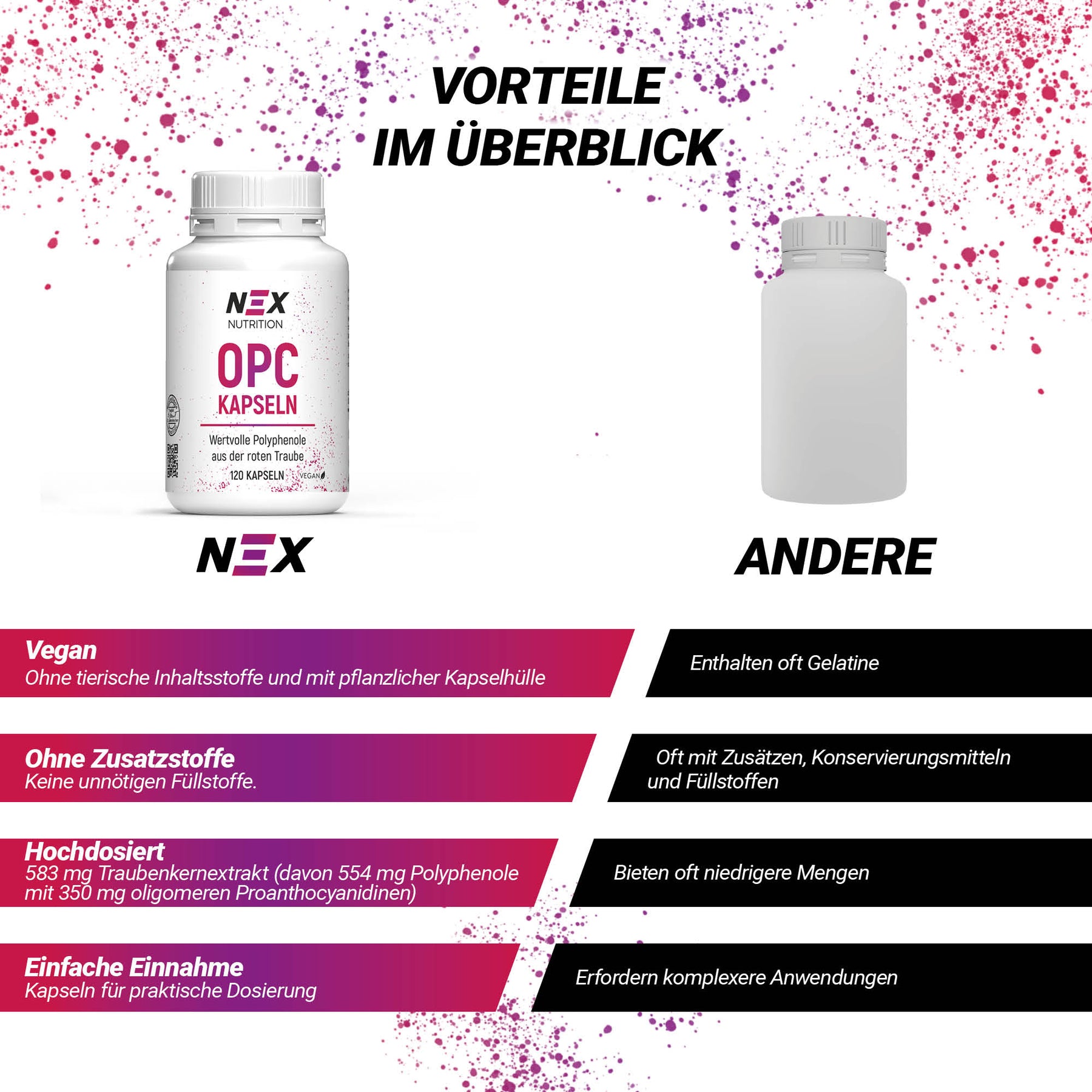 NEX OPC Kapseln wurden für alle entwickelt, die ihre Ernährung gezielt mit pflanzlichen Polyphenolen ergänzen möchten. Die Kapseln enthalten hochwertigen Traubenkernextrakt aus roten Weintrauben (