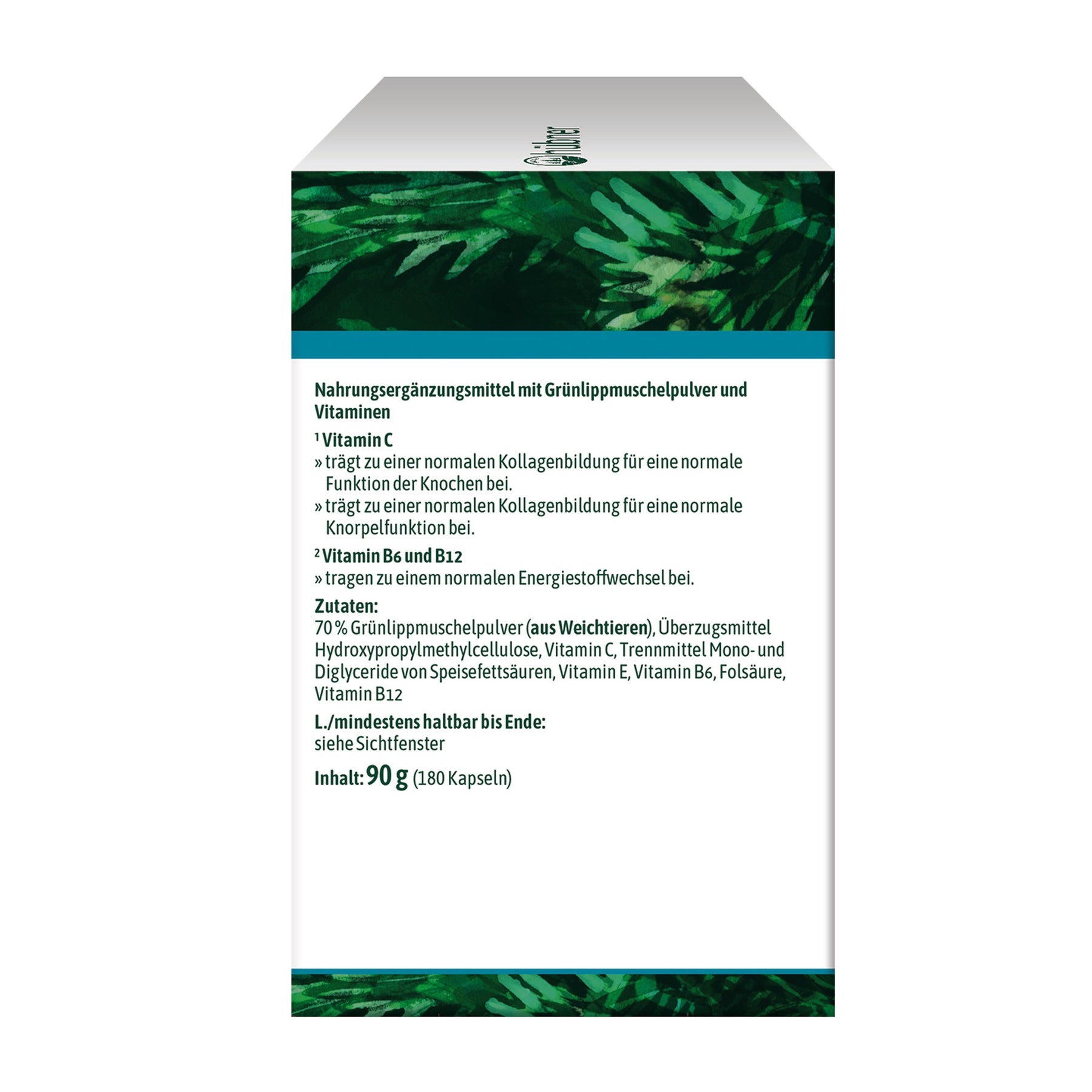 In hübner® arthoro Grünlippmuschel sind zahlreiche wertvolle Vitamine enthalten, die an wichtigen Stoffwechselprozessen im Körper beteiligt sind. Die Vitamine B6 und B12 tragen zu einem normalen Energiestoffwechsel bei. Vitamin C trägt zu einer normalen Kollagenbildung für eine normale Funktion der Knochen und Knorpelfunktion bei. Das enthaltene Vitamin E ergänzt das Vitamin C und leistet zudem noch einen Beitrag dazu, die Zellen vor oxidativem Stress zu schützen.