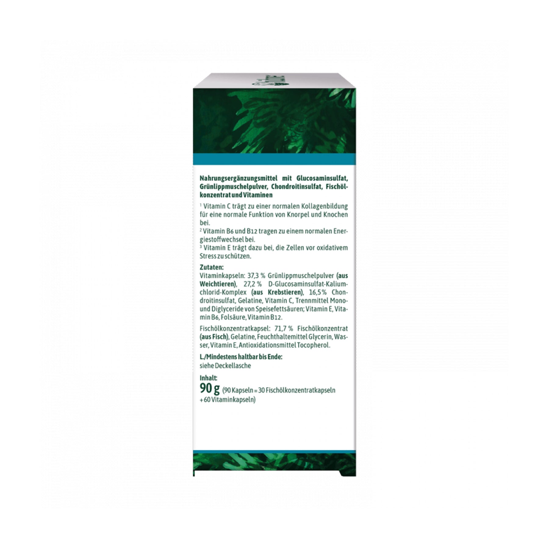 Vitaminkapseln: 37,3 % Grünlipp-Muschelkonzentrat (aus Weichtieren), 27,2 % D-Glukosaminsulfat-Kaliumchlorid-Komplex (aus Krebstieren), 16,5 % Chondroitinsulfat, Gelatine, L-Ascorbinsäure, Trennmittel Mono- und Diglyceride von pflanzlichen Speisefettsäuren, D-alpha-Tocopherylacetat, Pyridoxinhydrochlorid, Pteroylmonoglutaminsäure, Cyanocobalamin. Fischölkonzentratkapsel 69,8 % Fischölkonzentrat (aus Fisch), Gelatine, Feuchthaltemittel Glycerin, Wasser, Dalpha-Tocopherol, Antioxidationsmittel Tocopherol.