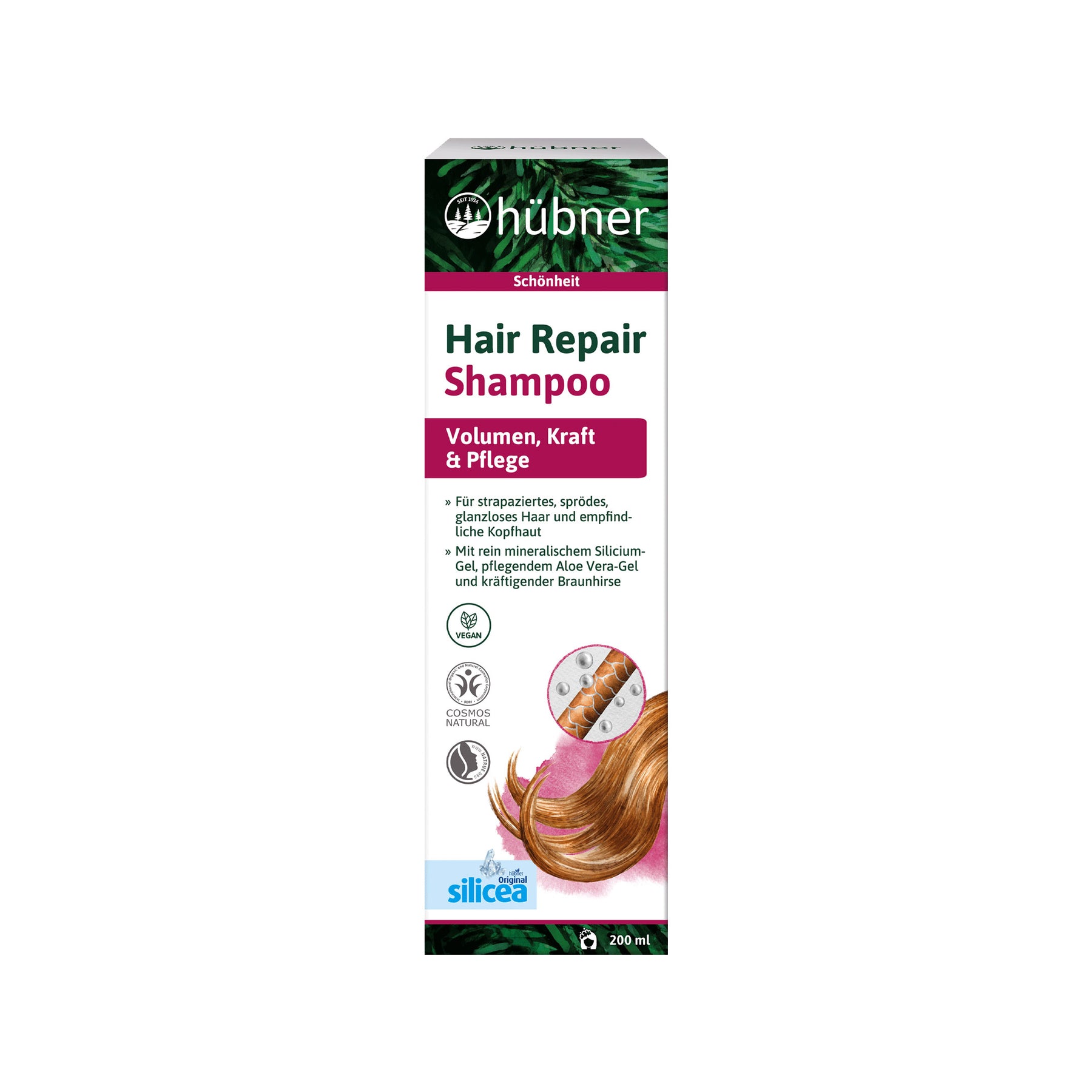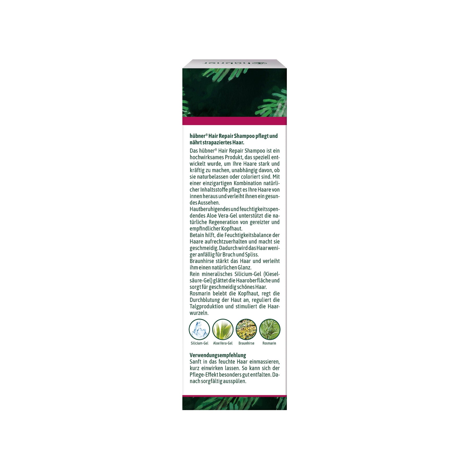 Repair & Care - Zertifizierte Naturkosmetik mit hochwertigen BIO-PflanzenwirkstoffenSprödem, strapaziertem Haar fehlt es oft an natürlicher Dichte und ausreichendem Volumen. Das hübner® Hair Repair Shampoo mit rein mineralischem Silicium-Gel und pflegendem Aloe Vera-Gel verleiht dem Haar mehr Kraft, Dichte und Volumen indem die inneren Zellverbindungen des Haares gestärkt und die Haarfasern repariert werden.