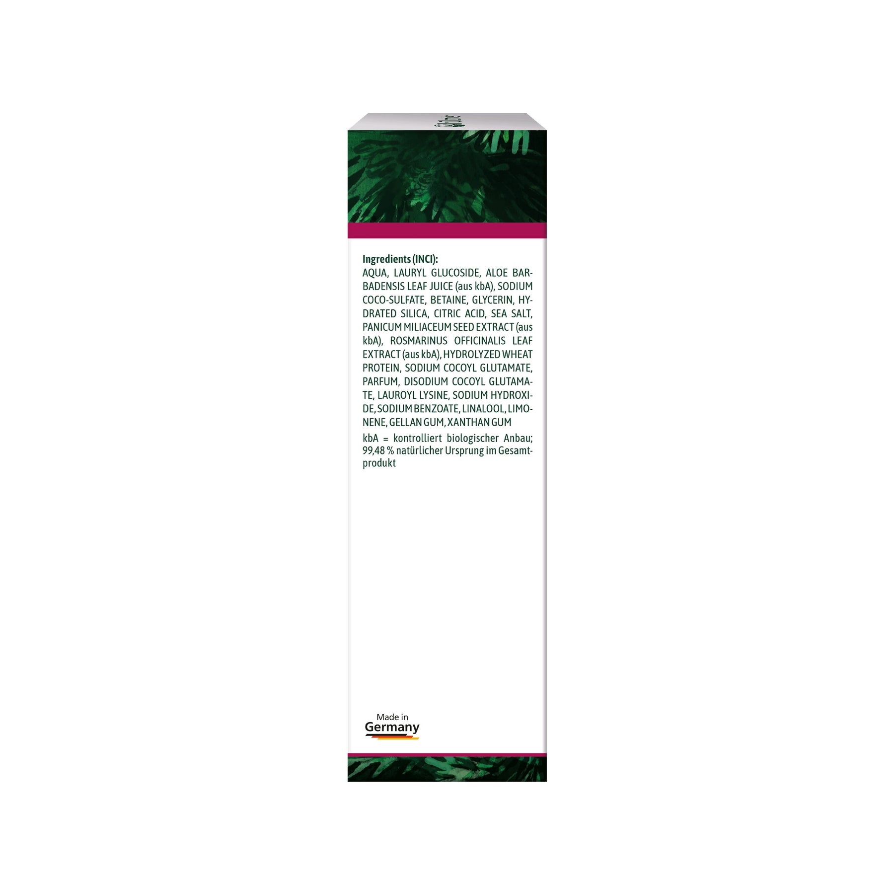 AQUA, LAURYL GLUCOSIDE, ALOE BARBADENSIS LEAF JUICE (aus kbA/from COF), SODIUM COCO-SULFATE, MARIS SAL, BETAINE, GLYCERIN, HYDRATED SILICA, TALC, PANICUM MILIACEUM SEED EXTRACT (aus kbA/from COF), ROSMARINUS OFFICINALIS LEAF EXTRACT (aus kbA/from COF), HYDROLYZED WHEAT PROTEIN, DISODIUM COCOYL GLUTAMATE, PARFUM, SODIUM COCOYL GLUTAMATE, SODIUM BENZOATE, LINALOOL, LIMONENE, XANTHAN GUM, CITRIC ACID