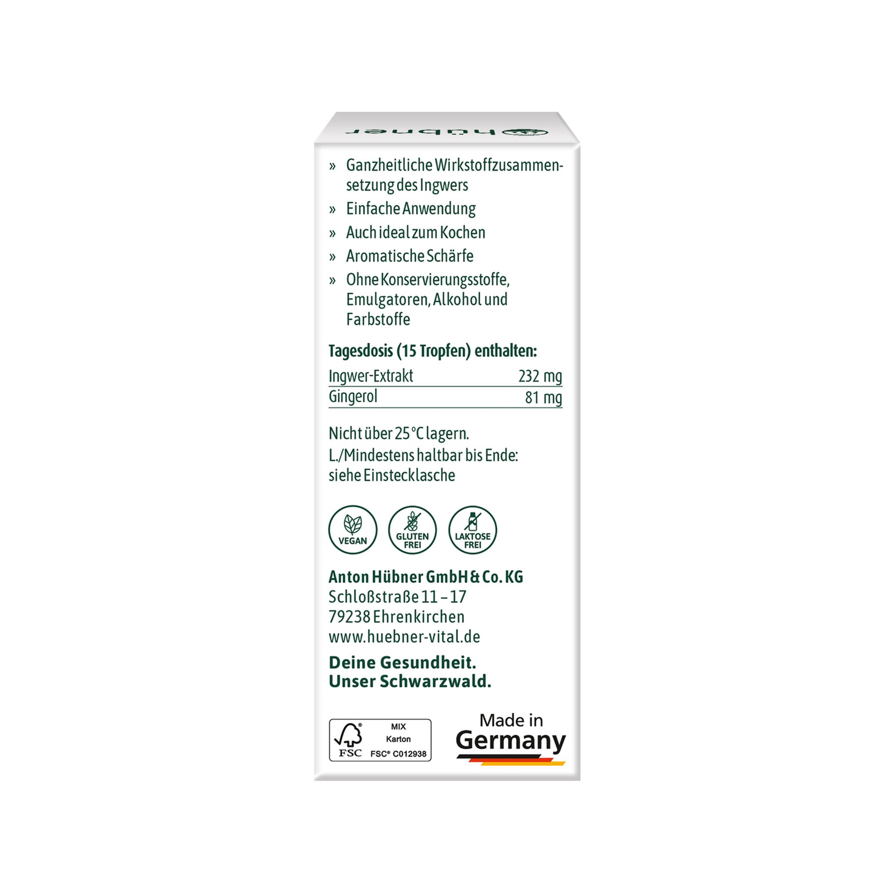 Das zeichnet die Ingwer Tropfen von Hübner aus: Die beruhigenden Tropfen für Magen und Darm kommen ganz ohne Konservierungsstoffe, Emulgatoren und Alkohol aus. Somit sind sie auch für empfindliche Mägen geeignet.