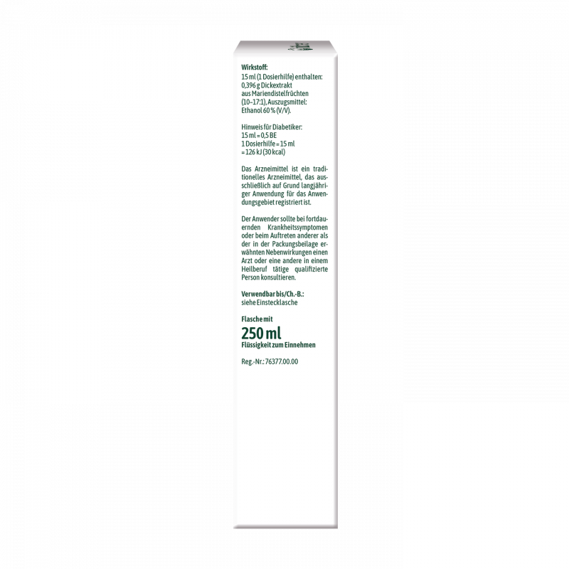 Inhaltsstoffe15 ml (1 Dosierhilfe) enthalten: 0,396 g Dickextrakt aus Mariendistelfrüchten (10–17:1), Auszugsmittel: Ethanol 60 % (V/V); sonstige Bestandteile: Sanddornbeeren, Fructose (Ph.Eur.), gereinigtes Wasser, Sorbitol-Lösung 70 % (nicht kristallisierend) (Ph.Eur.), Guar (Ph.Eur.), Kaliumsorbat (Ph.Eur.), Johannisbrotkernmehl, Ascorbinsäure, Pektin
