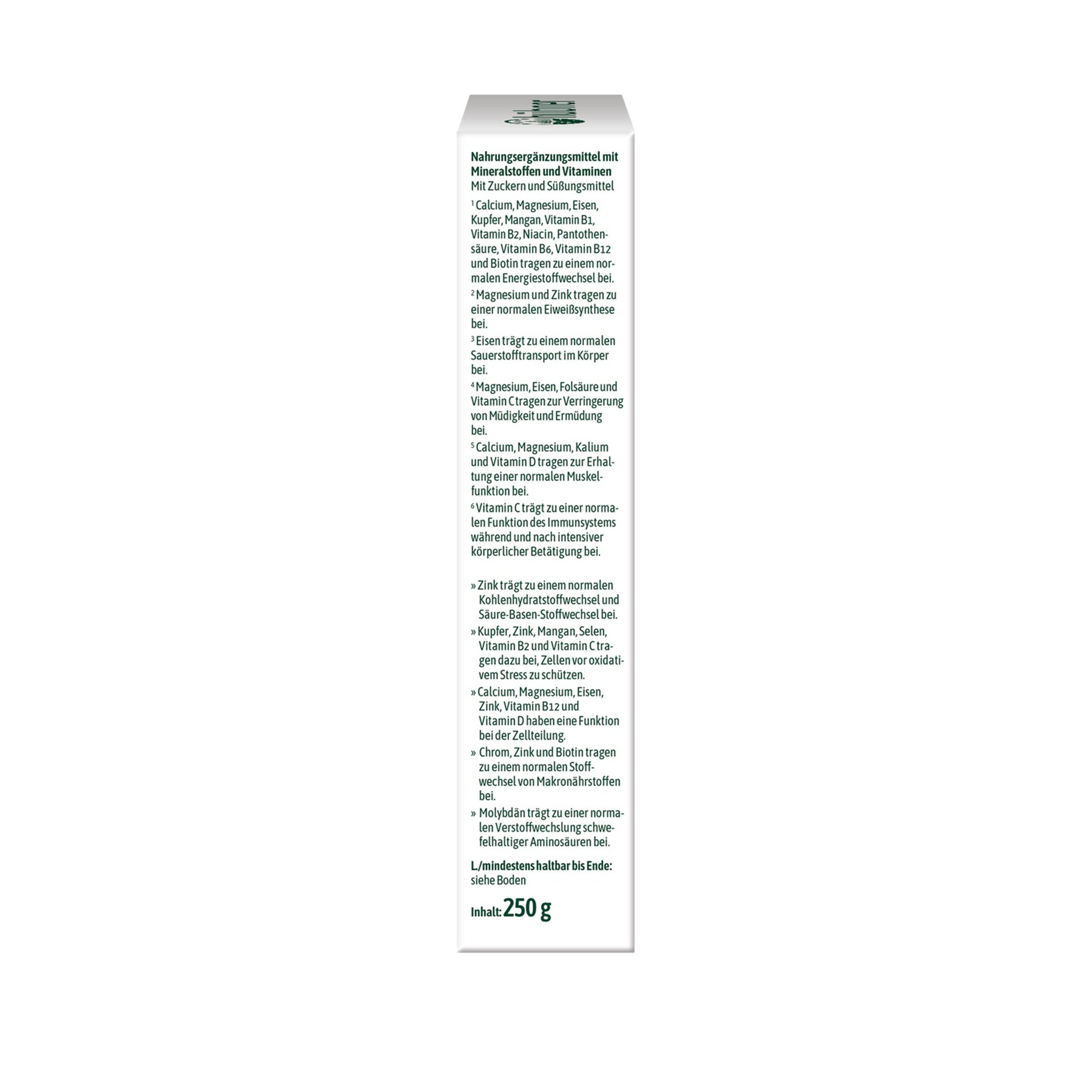 Vitamin C trägt zu einer normalen Funktion des Immunsystems während und nach intensiver körperlicher Betätigung bei. Calcium, Magnesium und die Vitamine B1, B2, B6, B12 tragen zu einem normalen Energiestoffwechsel bei. Magnesium trägt zu einer normalen Eiweißsynthese und einer normalen Muskelfunktion bei. Eisen trägt zu einem normalen Sauerstofftransport im Körper und zur Verringerung von Ermüdung bei. Zink trägt zu einem normalen Säure-Basen Stoffwechsel bei.