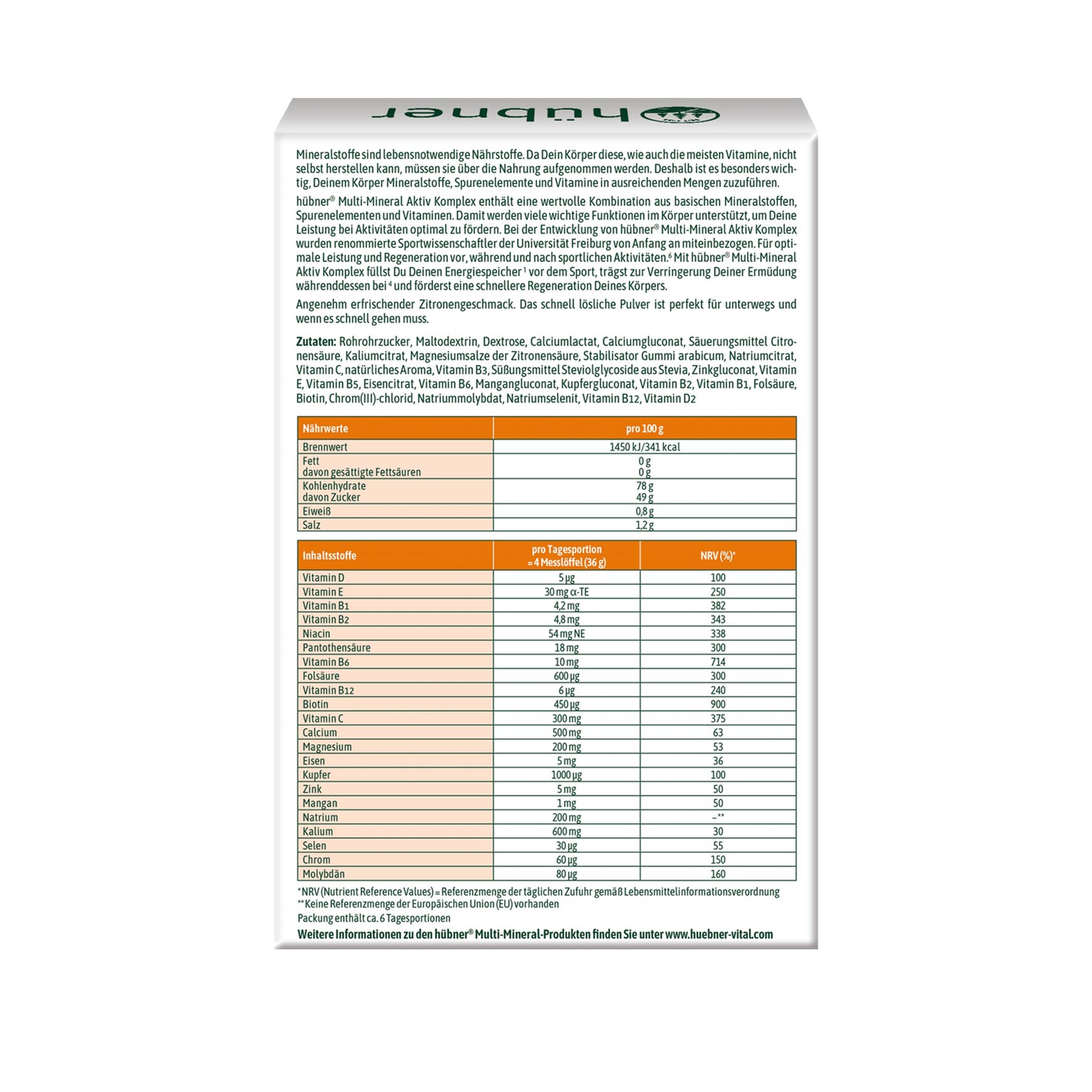 Rohrzucker, Maltodextrin, Dextrose, Calciumlactat, Calciumgluconat, Säuerungsmittel Citronensäure, Kaliumcitrat, Magnesiumsalze der Citronensäure, Stabilisator Gummi Arabicum, Natriumcitrat, L-Ascorbinsäure, natürliches Aroma, Nicotinamid, Süßungsmittel Steviolglycoside, Zinkgluconat, D-alpha Tocopherylacetat, Calcium-D-pantothenat, Eisencitrat, Pyridoxinhydrochlorid, Mangangluconat, Kupfergluconat, Natrium-Riboflavin-5-Phosphat, Thiaminmononitrat, Pteroylmonoglutaminsäure, D-Biotin, Chrom(III)-chlorid, Natriummolybdat, Natriumselenit, Cyanocobalamin, Ergocalcifer