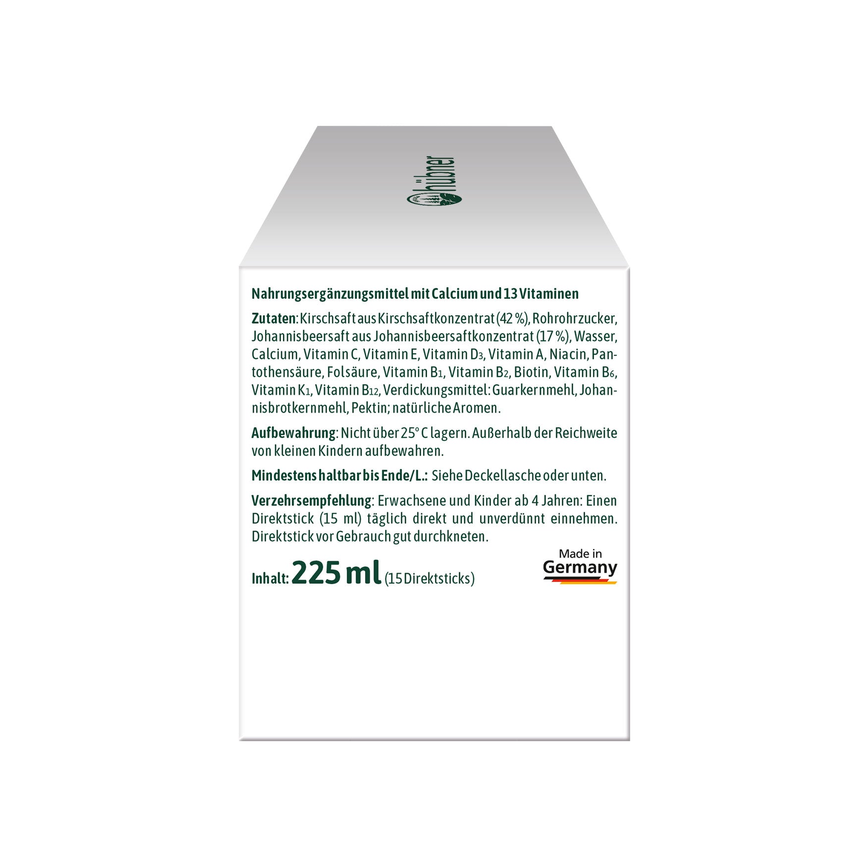 ZutatenKirschsaft aus Kirschsaftkonzentrat (42 %), Rohrohrzucker, Johannisbeersaft aus Johannisbeersaftkonzentrat (17 %), Wasser, Calcium, Vitamin C, Vitamin E, Vitamin D3, Vitamin A, Niacin, Pantothensäure, Folsäure, Vitamin B1, Vitamin B2, Biotin, Vitamin B6, Vitamin K1, Vitamin B12, Verdickungsmittel: Guarkernmehl, Joannisbrotkernmehl, Pektin; natürliche Aromen.