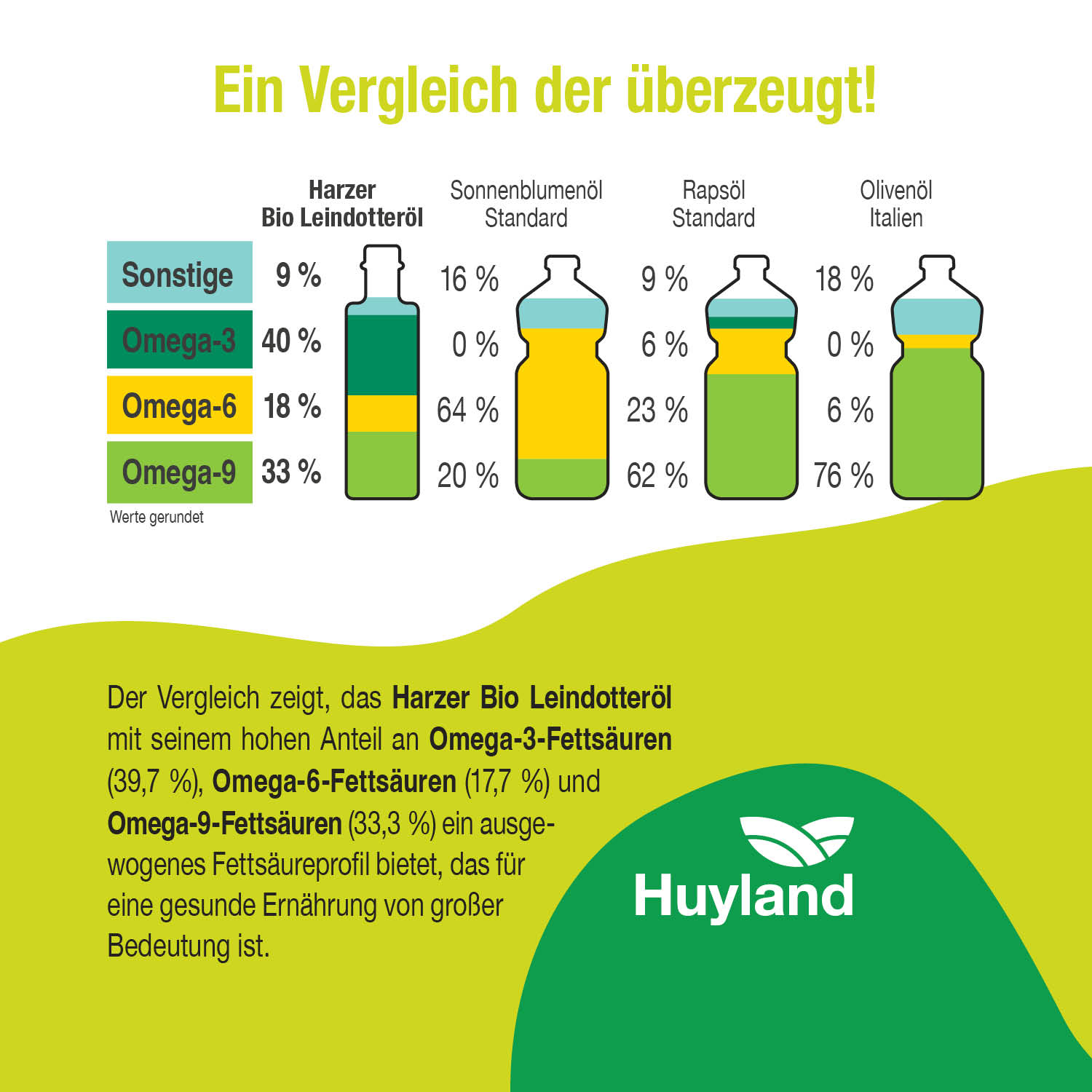 Bio Harzer Omega 3 Leindotteröl ist ein hochwertiges Öl, das aus den Samen der Leindotterpflanze (Camelina sativa) gewonnen wird. Mit seinem hohen Anteil an Omega-3-Fettsäuren (39,70 %), Omega-6-Fettsäuren (17,70 %) und Omega-9-Fettsäuren (33,30 %) bietet es ein ausgewogenes Fettsäureprofil, das für eine gesunde Ernährung von großer Bedeutung ist. Erfahre hier mehr über die gesundheitlichen Vorteile, Verwendungsmöglichkeiten und leckere Rezeptideen mit Bio Harzer Omega 3 Leindotteröl.