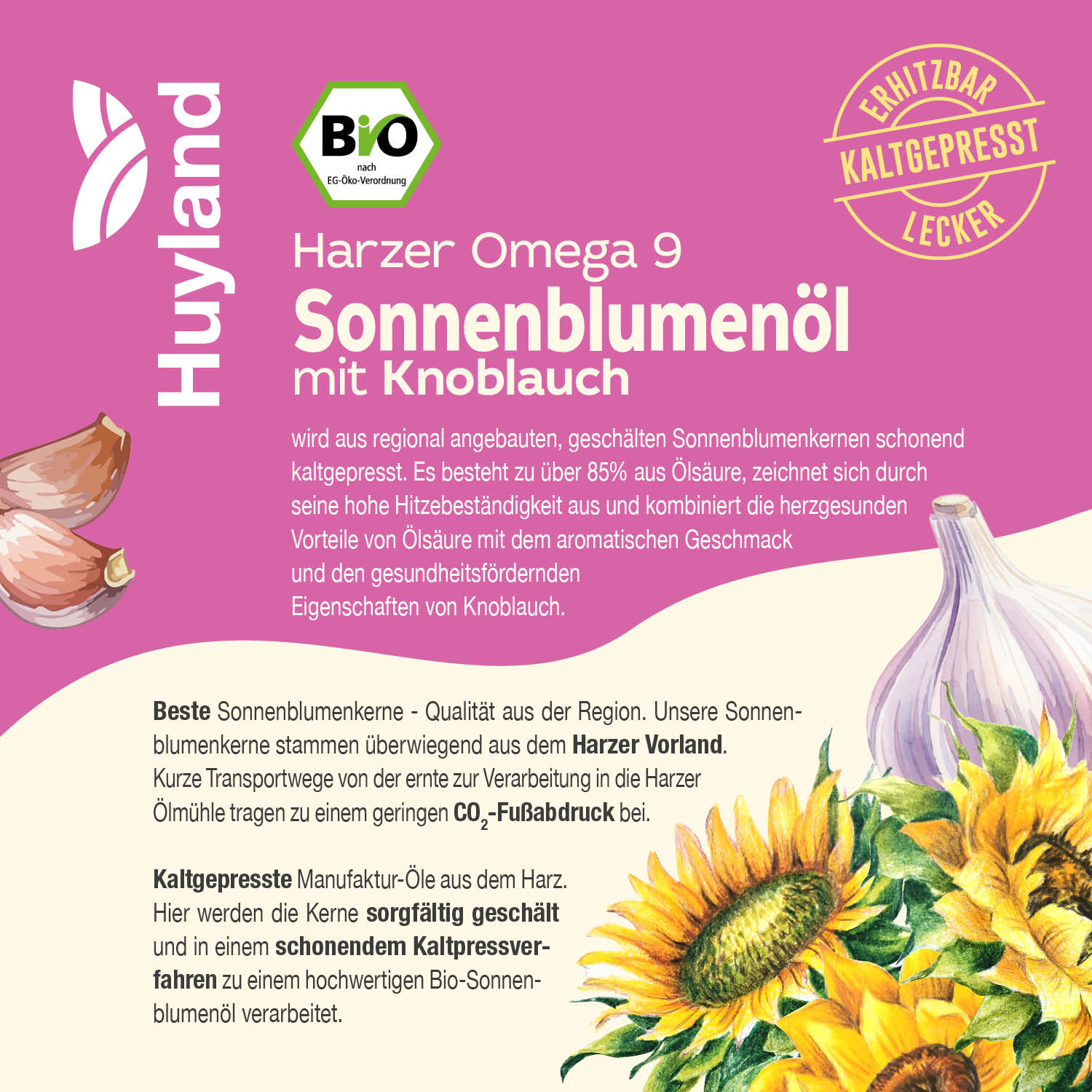 Bio Harzer Omega 9 Sonnenblumenöl mit Knoblauch kombiniert die gesundheitlichen Vorteile von Harzer Sonnenblumenöl, das reich an Ölsäure ist und das Herz-Kreislauf-System unterstützt, mit dem aromatischen Geschmack und den gesundheitsfördernden Eigenschaften von Knoblauch. Das Öl hat einen hohen Rauchpunkt und ist somit ideal zum Braten und Rösten geeignet, während das Knoblauchgranulat eine praktische und geschmackvolle Alternative zu frischem Knoblauch bietet.