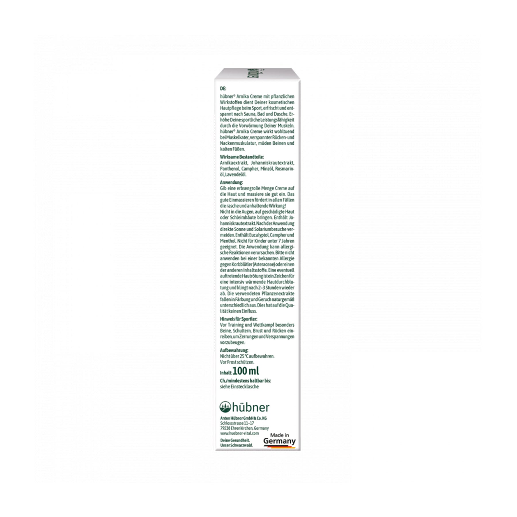 Diese Sport- und Massagecreme mit pflanzlichen Wirkstoffen dient der kosmetischen Hautpflege beim Sport, erfrischt und stärkt nach Sauna, Bad und Dusche, steigert sportliche Leistungen durch die vorbereitende Erwärmung der Muskeln und hilft, Kälteschäden beim Wintersport zu verhindern. Arnika-Creme wirkt auch wohltuend bei Muskelkater, Verspannung der Rücken- und Nackenmuskulatur, ermüdeten Beinen und kalten Füßen.