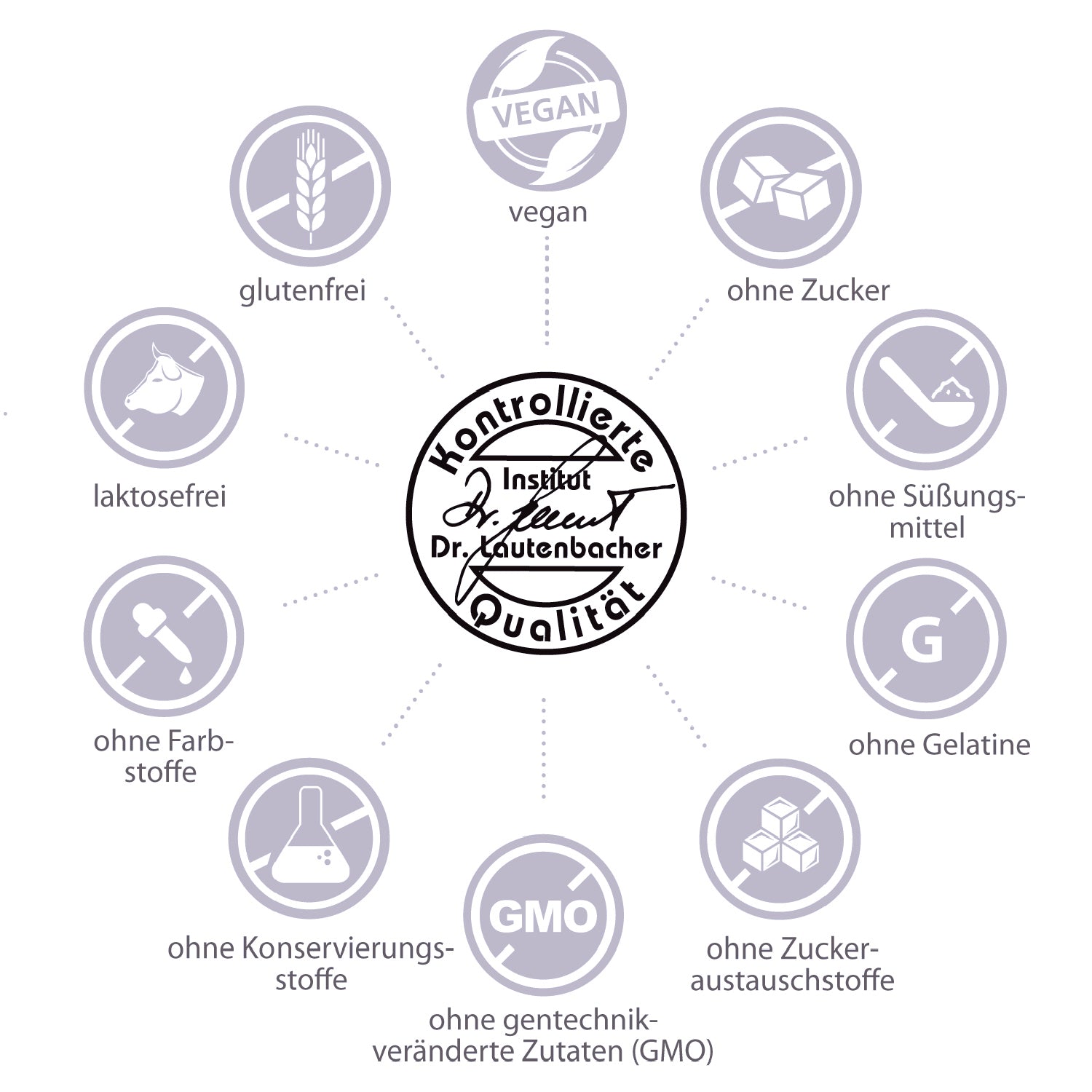 Sojaöl; Gelatine; pflanzliche Fette (Kokos, Palmkern); Feuchthaltemittel: Glycerin; Coenzym Q10 (6,4 %); D-alpha-Tocopherol; Butterfett; Emulgator: Lecithine (Soja); Natriumselenat; Farbstoff: Beta-Carotin.