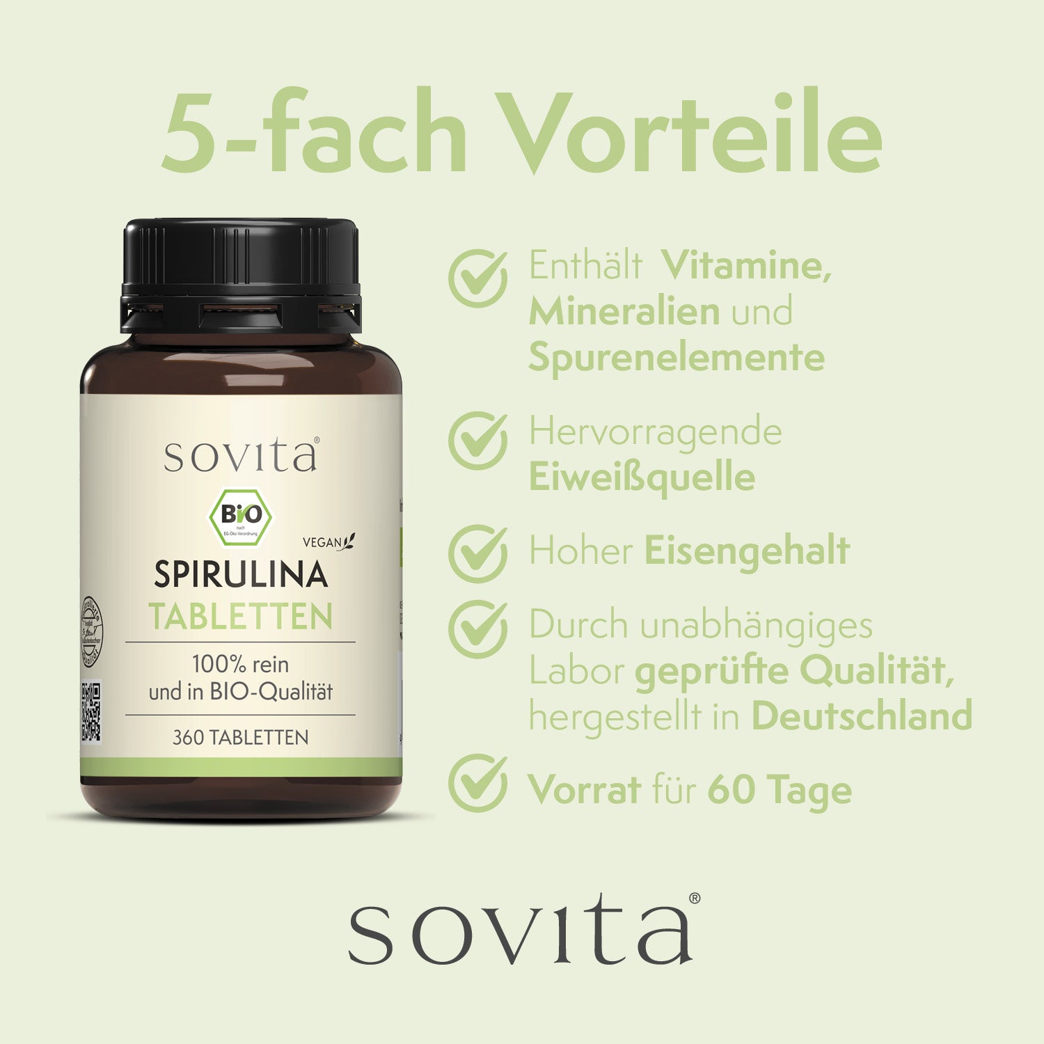 Die sovita BIO Spirulina Tabletten bestehen zu 100 % aus reinem Spirulina platensis-Pulver, das unter kontrollierten Bedingungen kultiviert, schonend getrocknet und ohne Zusatzstoffe zu Tabletten gepresst wird. Die Mikroalge Spirulina zählt zu den ältesten bekannten Organismen und wird weltweit wegen ihrer natürlichen Nährstoffdichte geschätzt. Besonders bemerkenswert ist ihr hoher Proteingehalt von 60 %, wodurch sie sich hervorragend als pflanzliche Eiweißquelle eignet.