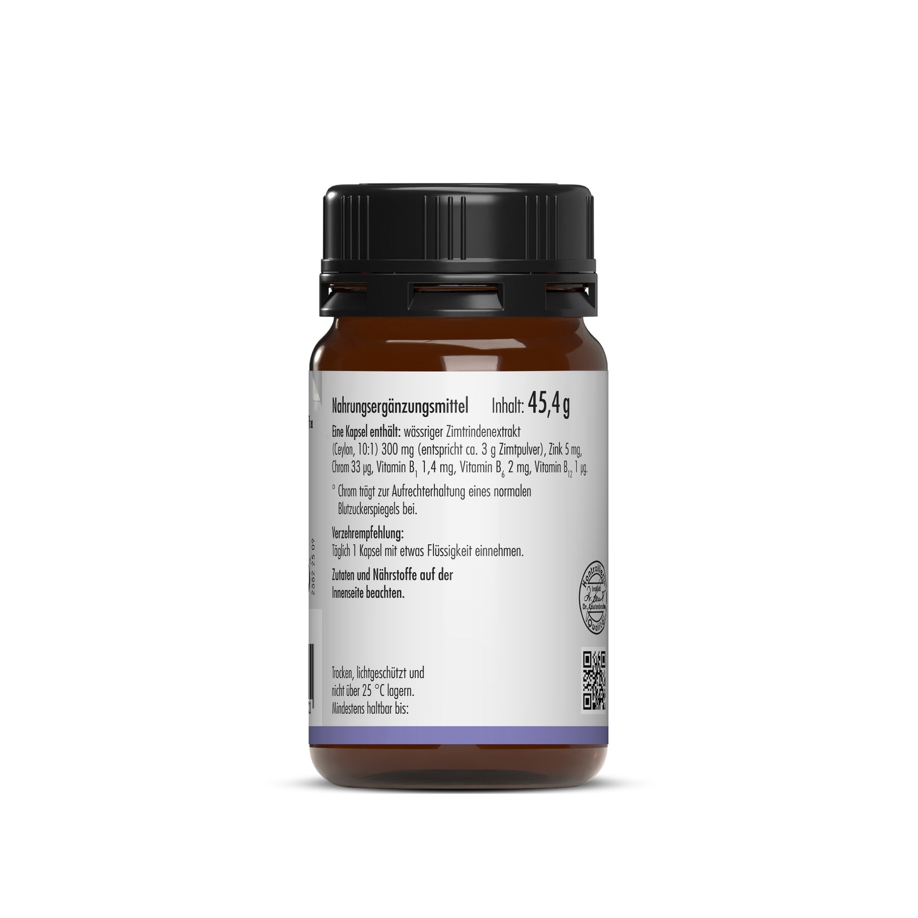 Eine Kapsel enthält: wässriger Zimtrindenextrakt (Ceylon, 10:1) 300 mg (entspricht ca. 3 g Zimtpulver), Zink 5 mg, Chrom 33 μg, Vitamin B1 1,4 mg, Vitamin B6 2 mg, Vitamin B12 1 μg. ° Chrom trägt zur Aufrechterhaltung eines normalen Blutzuckerspiegels bei.