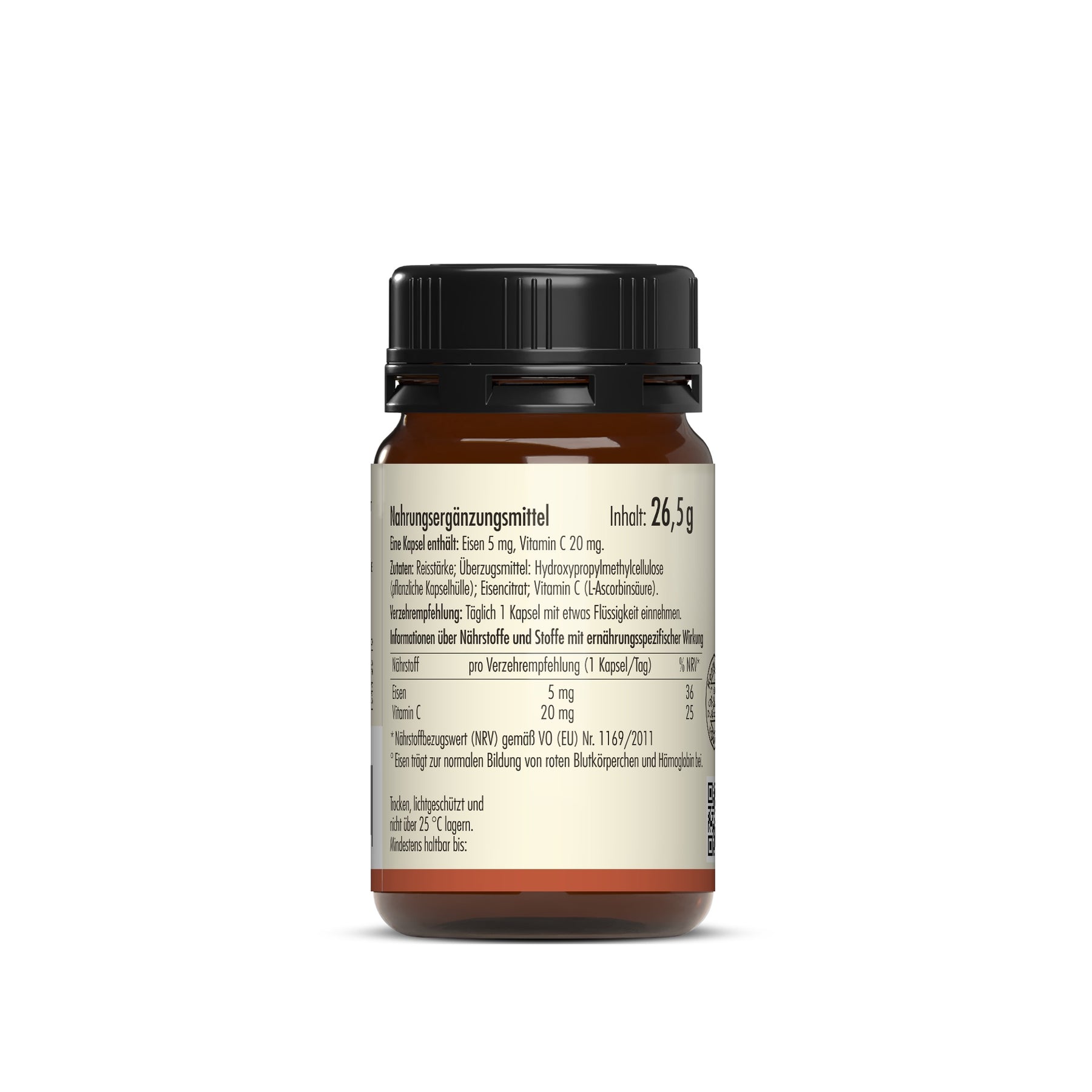 Zur Unterstützung der Blutbildung und des Immunsystems Unsere Eisen plus Vitamin C Kapseln bieten eine ausgewogene Kombination aus 5 mg Eisen und 20 mg Vitamin C. Mit nur einer Kapsel täglich unterstützen Sie auf praktische Weise Ihre tägliche Versorgung mit diesen wichtigen Nährstoffen.