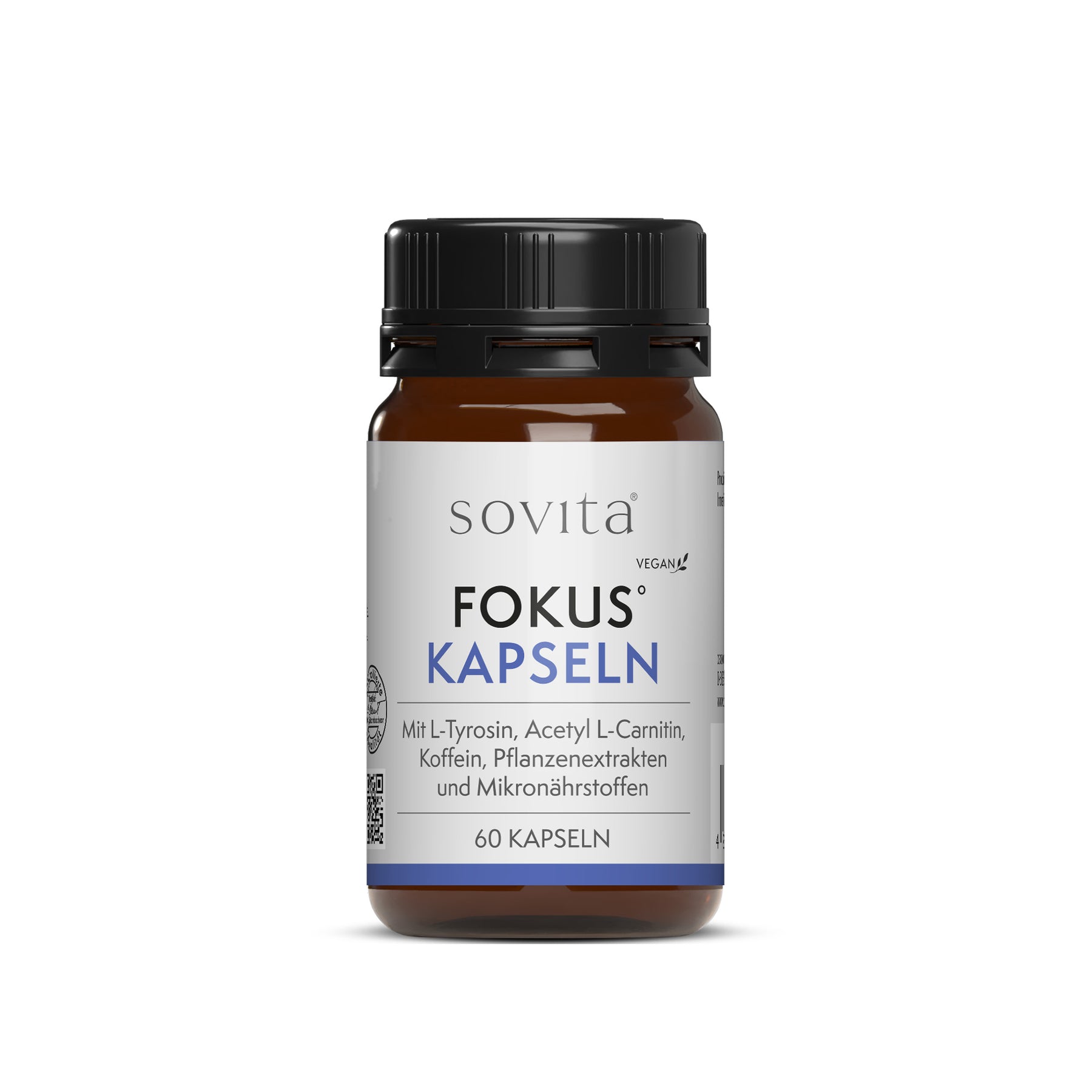 Die sovita Fokus Kapseln enthalten eine speziell abgestimmte Kombination aus Aminosäuren, pflanzlichen Extrakten sowie ausgewählten Mikronährstoffen, die gezielt die mentale Leistungsfähigkeit unterstützen können. Enthalten sind unter anderem L-Tyrosin, Acetyl-L-Carnitin, Koffein, L-Theanin (aus Grüntee), Zink, Vitamin B12 sowie Piperin aus schwarzem Pfeffer.