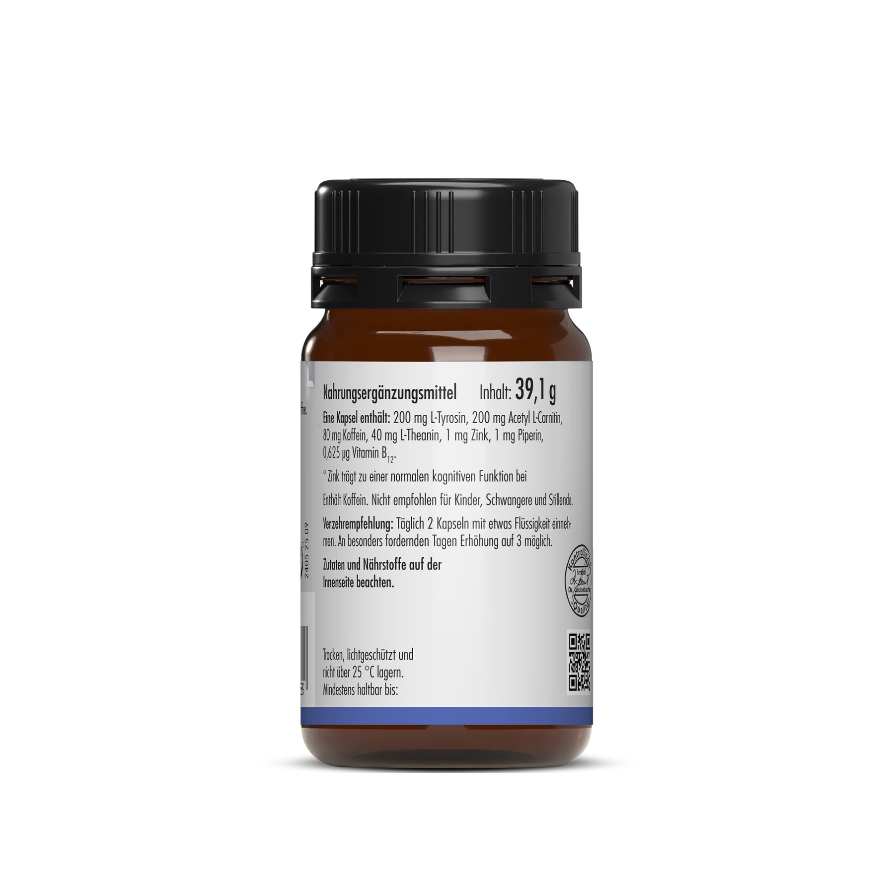 Eine Kapsel enthält:L-Tyrosin 200 mg, Acetyl-L-Carnitin 200 mg, Koffein 80 mg, Grüner Teeextrakt 40,8 mg (davon L-Theanin 40 mg), Zink 1 mg, Schwarzer Pfefferextrakt 1,05 mg (davon Piperin 1 mg), Vitamin B12 1,25 μg.