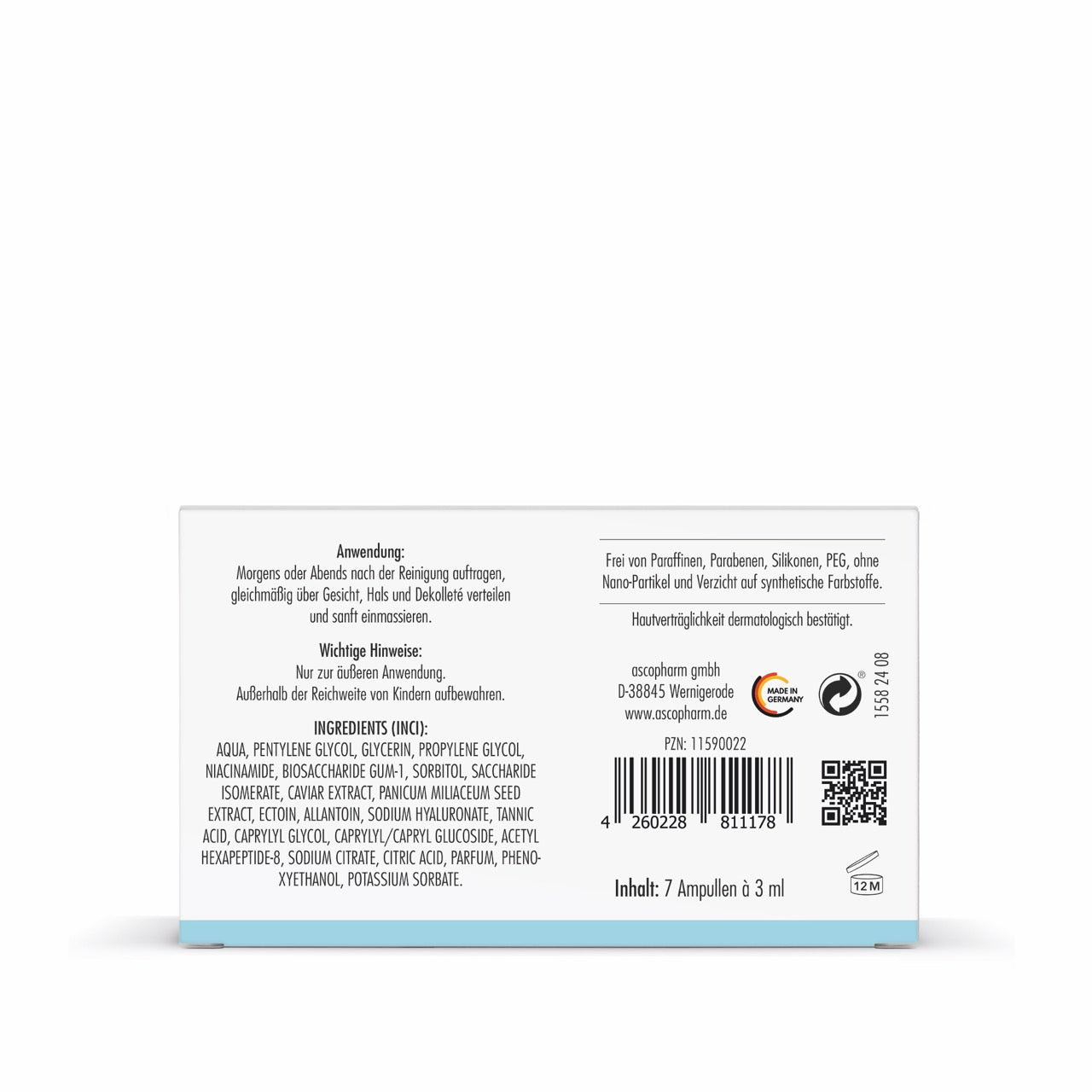 Erleben Sie konzentrierte Hautpflege – perfekt dosiert in einer Ampulle! INGREDIENTSAQUA, PENTYLENE GLYCOL, GLYCERIN, PROPYLENE GLYCOL, NIACINAMIDE, BIOSACCHARIDE GUM-1, SORBITOL, SACCHARIDE ISOMERATE, CAVIAR EXTRACT, PANICUM MILIACEUM SEED EXTRACT, ECTOIN, ALLANTOIN, SODIUM HYALURONATE, TANNIC ACID, CAPRYLYL GLYCOL, CAPRYLYL/CAPRYL GLUCOSIDE, ACETYL HEXAPEPTIDE-8, SODIUM CITRATE, CITRIC ACID, PARFUM, PHENOXETHANOL, POTASSIUM SORBATE.