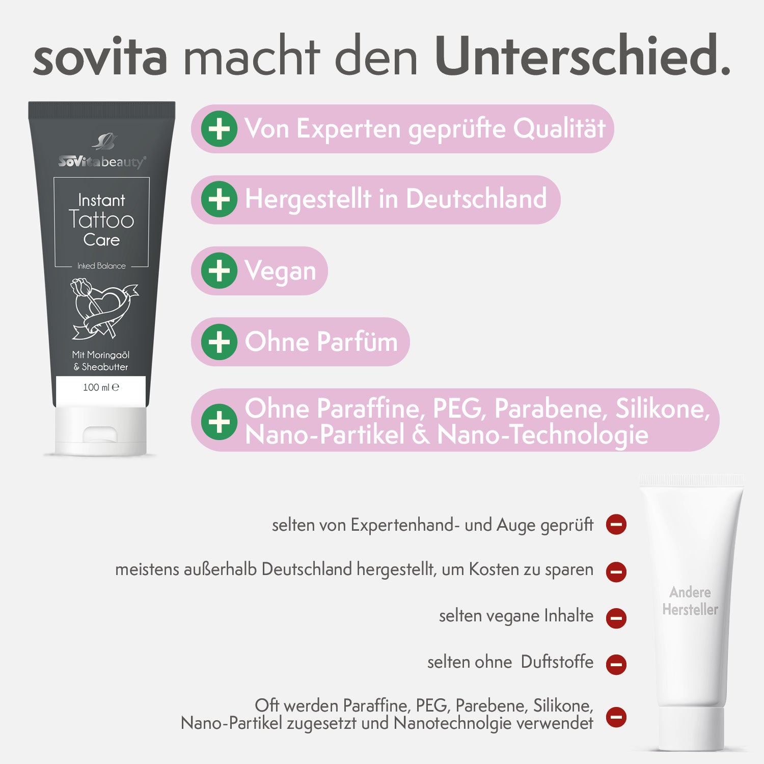 - Die Creme zieht schnell ein, verhindert ein Austrocknen des Tattoos und klebt nicht an Kleidung