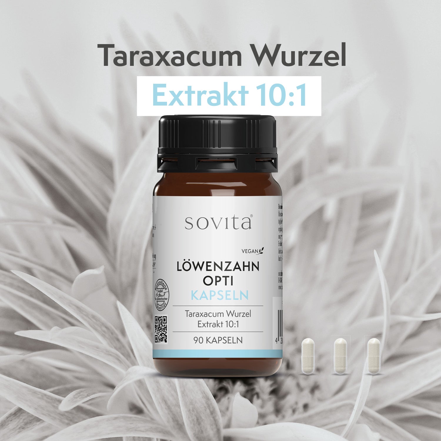 Die sovita Löwenzahn Opti Kapseln enthalten einen hochwertigen Löwenzahnwurzelextrakt im Verhältnis 10:1 – das entspricht der zehnfachen Konzentration des pflanzlichen Ausgangsmaterials. Löwenzahn (Taraxacum officinale) ist traditionell bekannt für seinen Gehalt an sekundären Pflanzenstoffen und wird seit jeher in der Ernährung geschätzt.