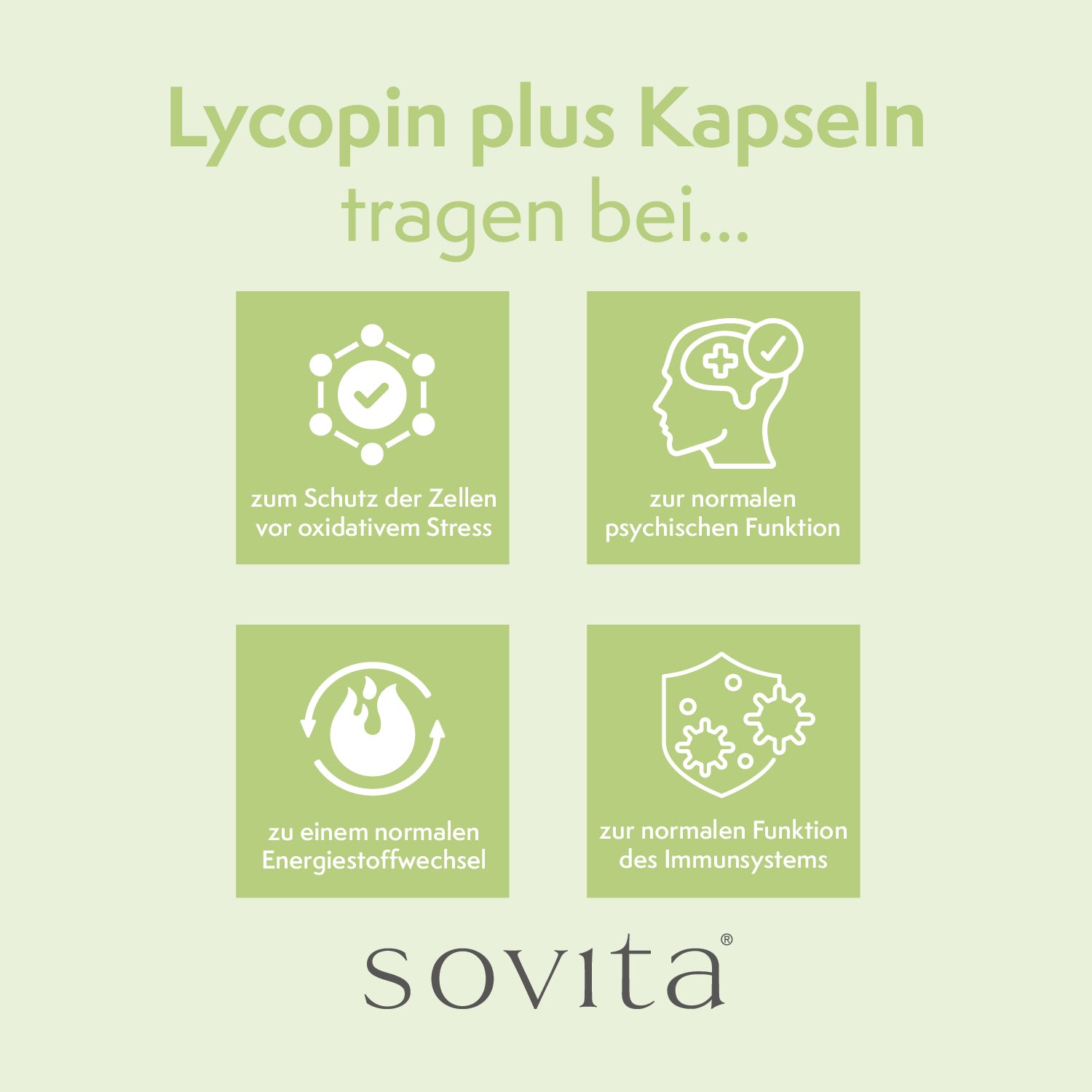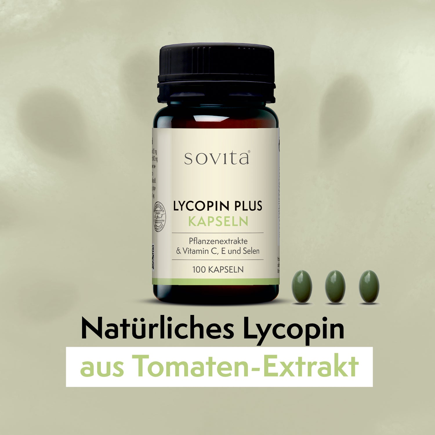 Die sovita Lycopin Plus Kapseln versorgen den Körper mit wichtigen Antioxidantien. Jede Kapsel liefert Lycopin kombiniert mit Grüntee- und Traubenkernextrakt, Lutein sowie Beta-Carotin. Die enthaltenen Vitalstoffe Vitamin C, E und Selen tragen zum Schutz der Zellen vor oxidativem Stress bei. Sie fungieren als effektiver Antioxidans-Komplex. Eine ideale Nahrungsergänzung für alle, die ihre allgemeine Gesundheit, den Zellschutz und die körpereigene Abwehr unterstützen möchten.
