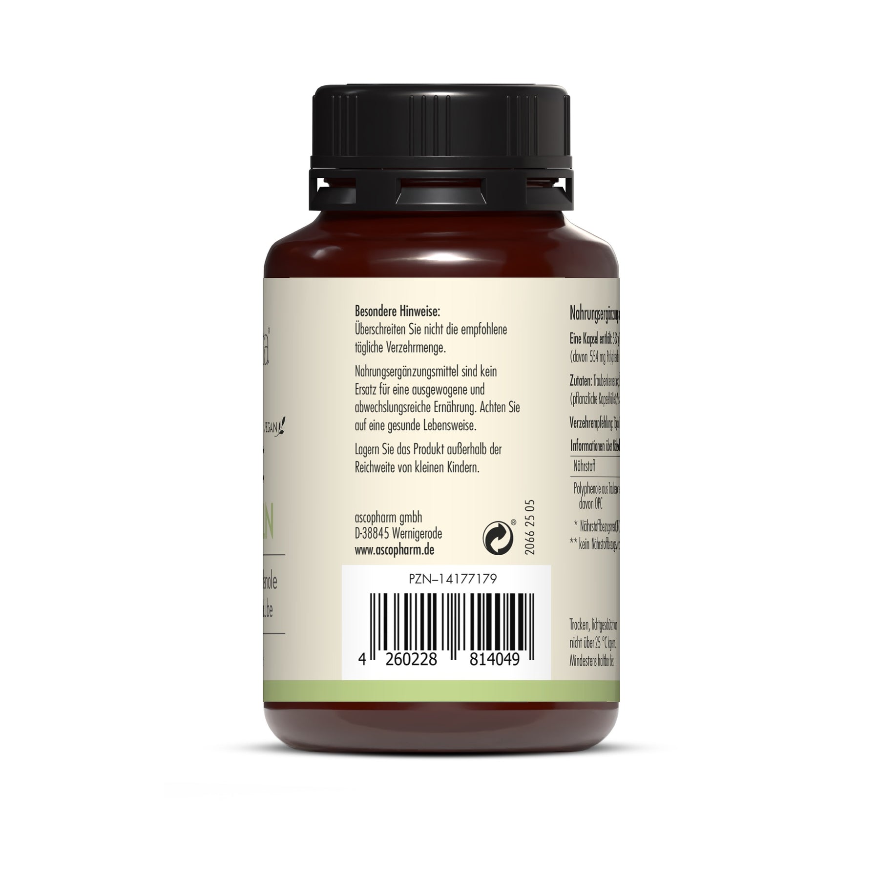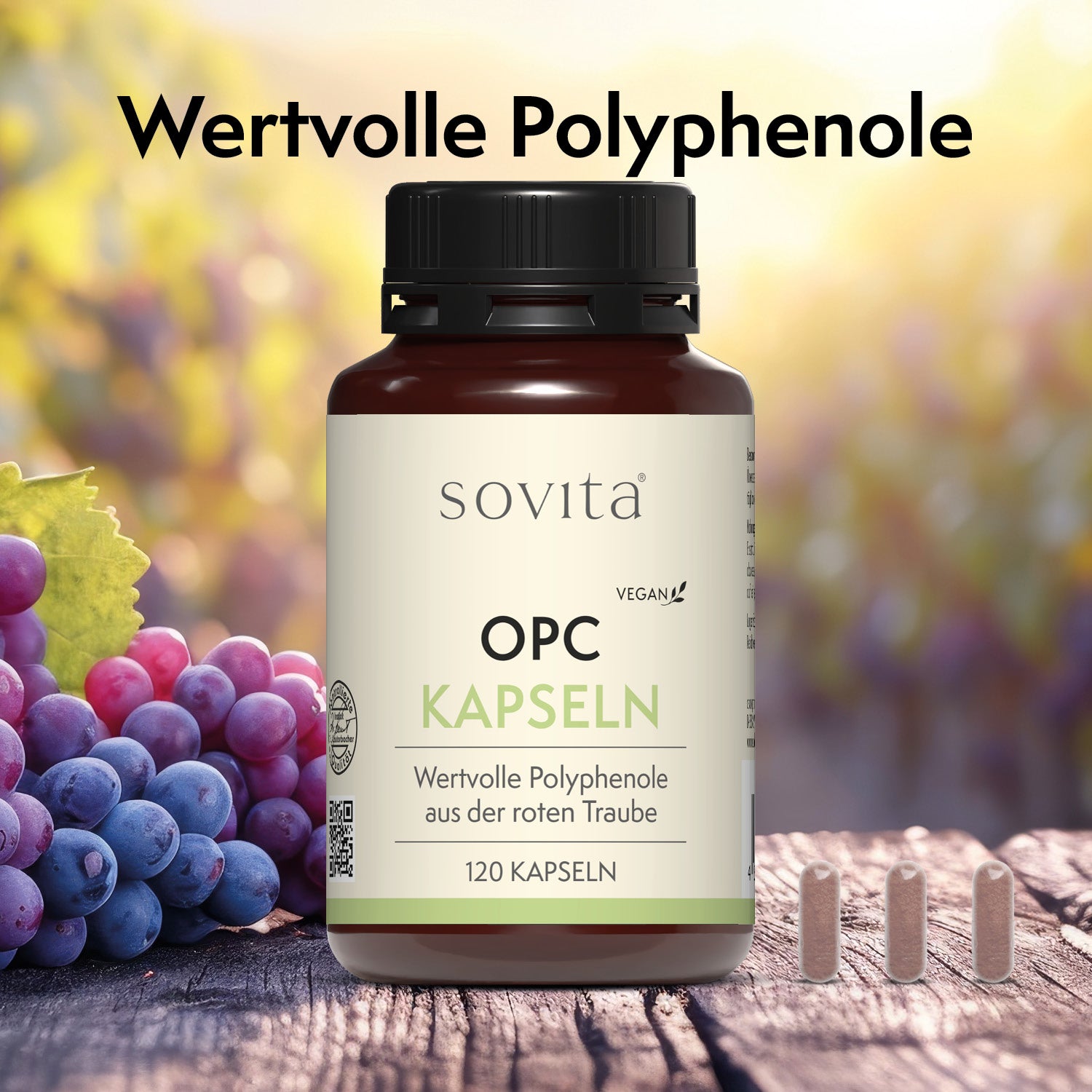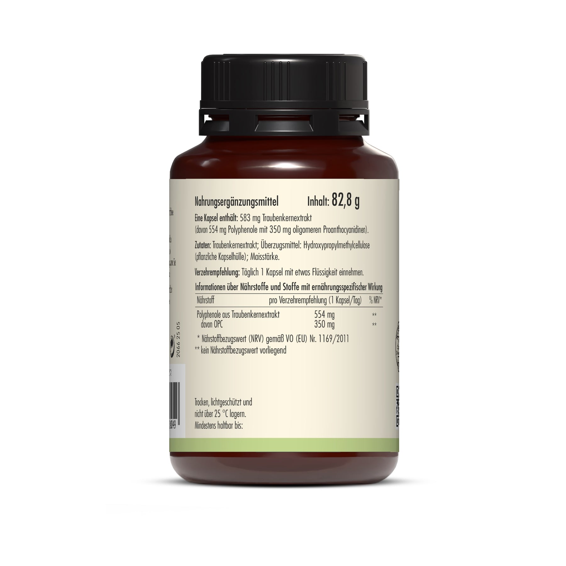 In den OPC Kapseln steckt die Kraft der roten Weintraube: Sie enthalten einen hochkonzentrierten Traubenkernextrakt, der natürlicherweise reich an Polyphenolen, insbesondere OPC (oligomeren Proanthocyanidinen) ist. Diese sekundären Pflanzenstoffe zählen zur Gruppe der Flavonoide und kommen vor allem in den Kernen und Schalen der Trauben vor. Jede Kapsel liefert 583 mg reinen Extrakt, davon 554 mg Polyphenole und 350 mg OPC – in standardisierter Qualität und gut dosierbar für die tägliche Ergänzung.