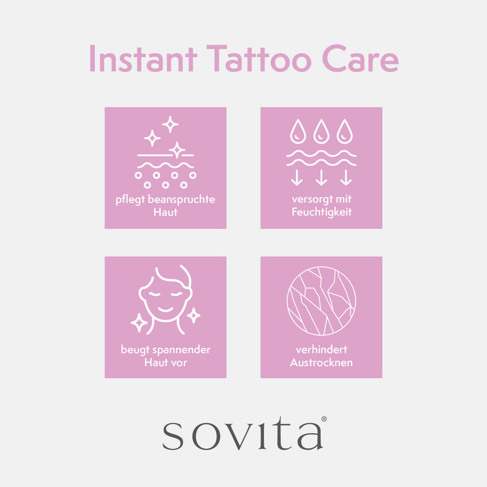 Infografik mit Vorteilen von Sovita Aloe Vera Gel: feuchtigkeitsspendend, hautberuhigend, kühlende Pflege