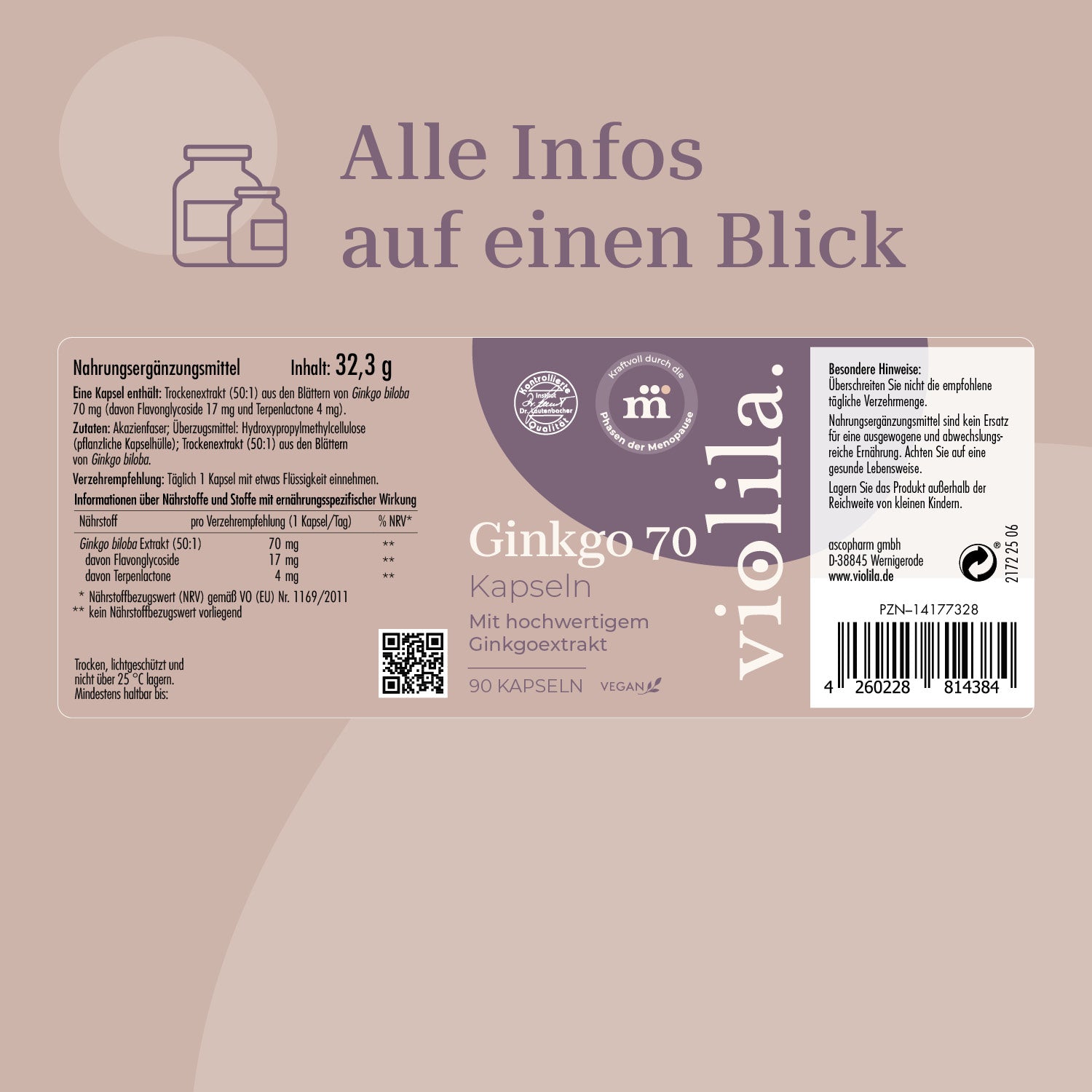 Die violila Ginkgo 70 Kapseln enthalten einen hochwertigen Ginkgo biloba Extrakt mit einem Gehalt von 70 mg Ginkgoblatt-Trockenextrakt (50:1). Dieser pflanzliche Extrakt wird seit Jahrhunderten in der traditionellen chinesischen Medizin geschätzt. Mit den Ginkgo Kapseln erhalten Sie ein hochwertiges Nahrungsergänzungsmittel.